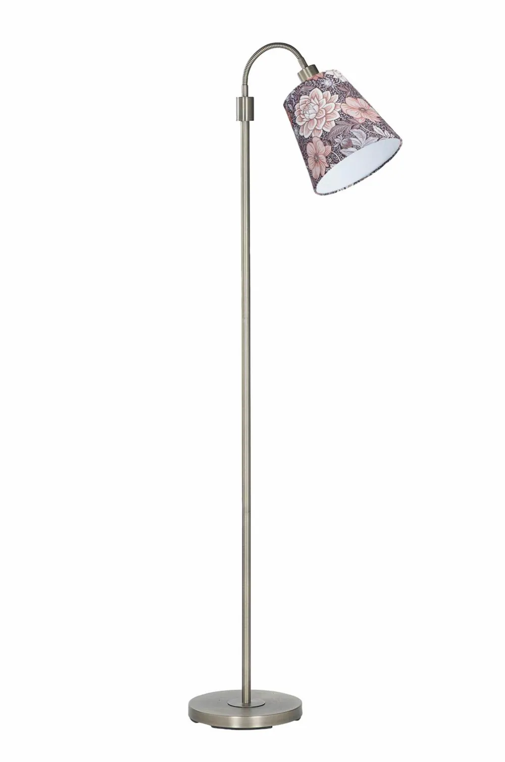 Gulvlampe amy flex i metal inklusive cia top fit-skærm. Skærmen har et mønster, i en rolig og beroligende farve, fra boråstapeter. Lampeskærmens mål: 20 cm i diameter forneden, 13 cm foroven og 19 cm i højden. E27 topmontering. Lampen leveres i knock-down-version og er nem at samle. Den øverste del af gulvlampen har en justerbar arm med e27-lampeholder, maks. 25w, hvor kontakten også er placeret. 190 cm lang ledning med vægudtag. Lyskilde købes separat. Højde 150 cm.