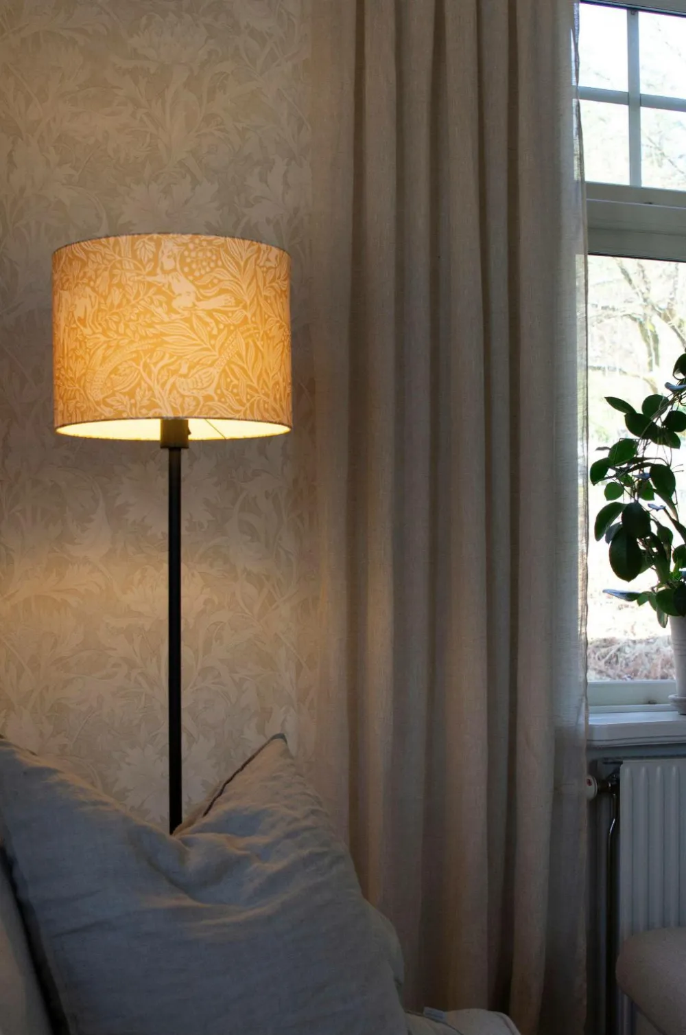 Gulvlampe amy i metal inklusive sara-lampeskærm. Skærmen har et mønster, i en rolig og beroligende farve, fra boråstapeter med en diameter på 35 cm og en højde på 25,5 cm. Lampen leveres i knock-down-version og er nem at samle. Afbryderen er placeret på den øverste del, som har en e27-lampeholder, maks. 25w. Ledning 190 cm med vægudtag. Højde 150 cm. Lyskilde e27 købes separat.