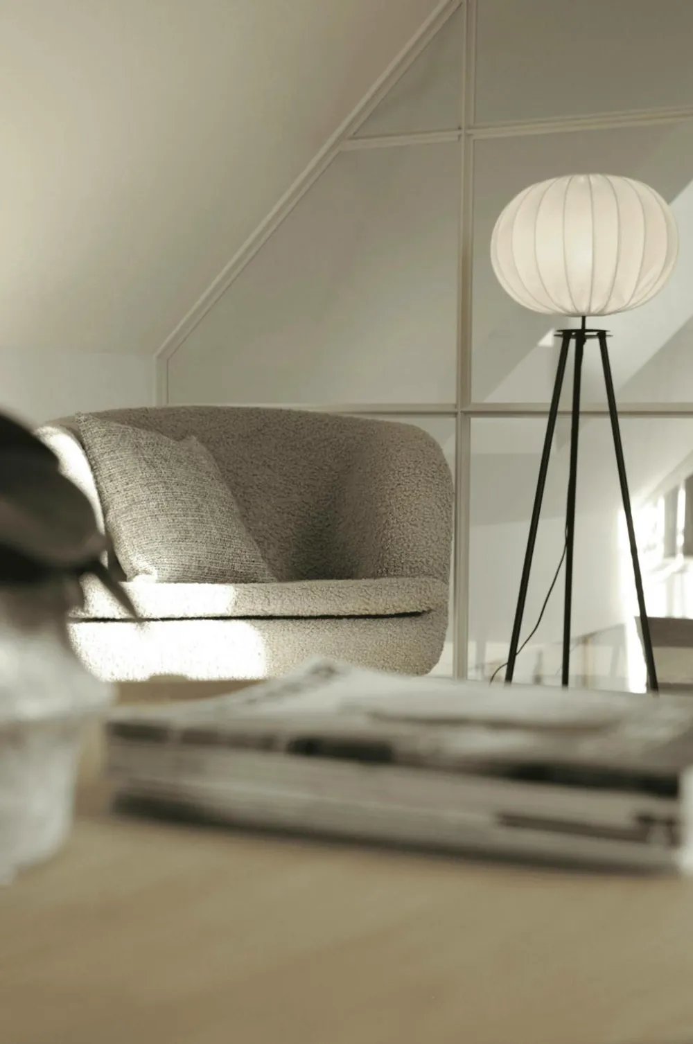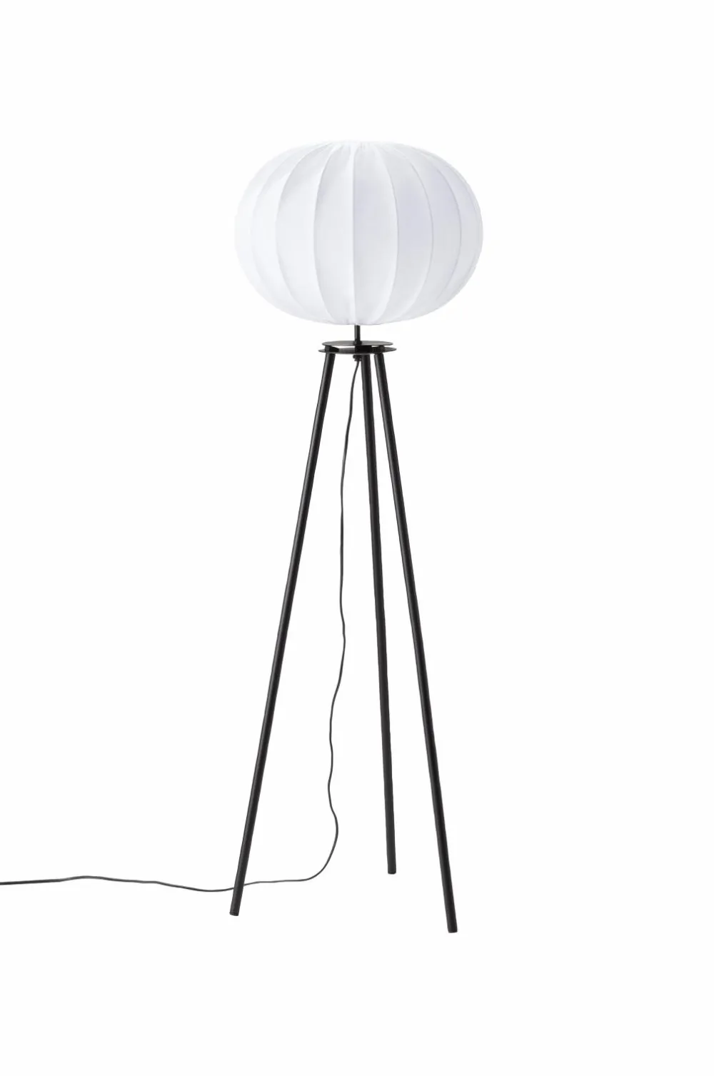 Gulvlampe base, trebenet metalgulvlampe, såkaldt tripod, med hvid hilma-lampeskærm i bomuld. Lampeskærmen er 40 cm i diameter. højde 125 cm, bund 40×40 cm. 3,4 m sort plastledning med gulvafbryder placeret ca. 130 cm fra lampeholderen. E27-fatning. Max 25w. Ip20. Lyskilde og lampeskærm medfølger ikke. Gulvlampen er nem at samle.
