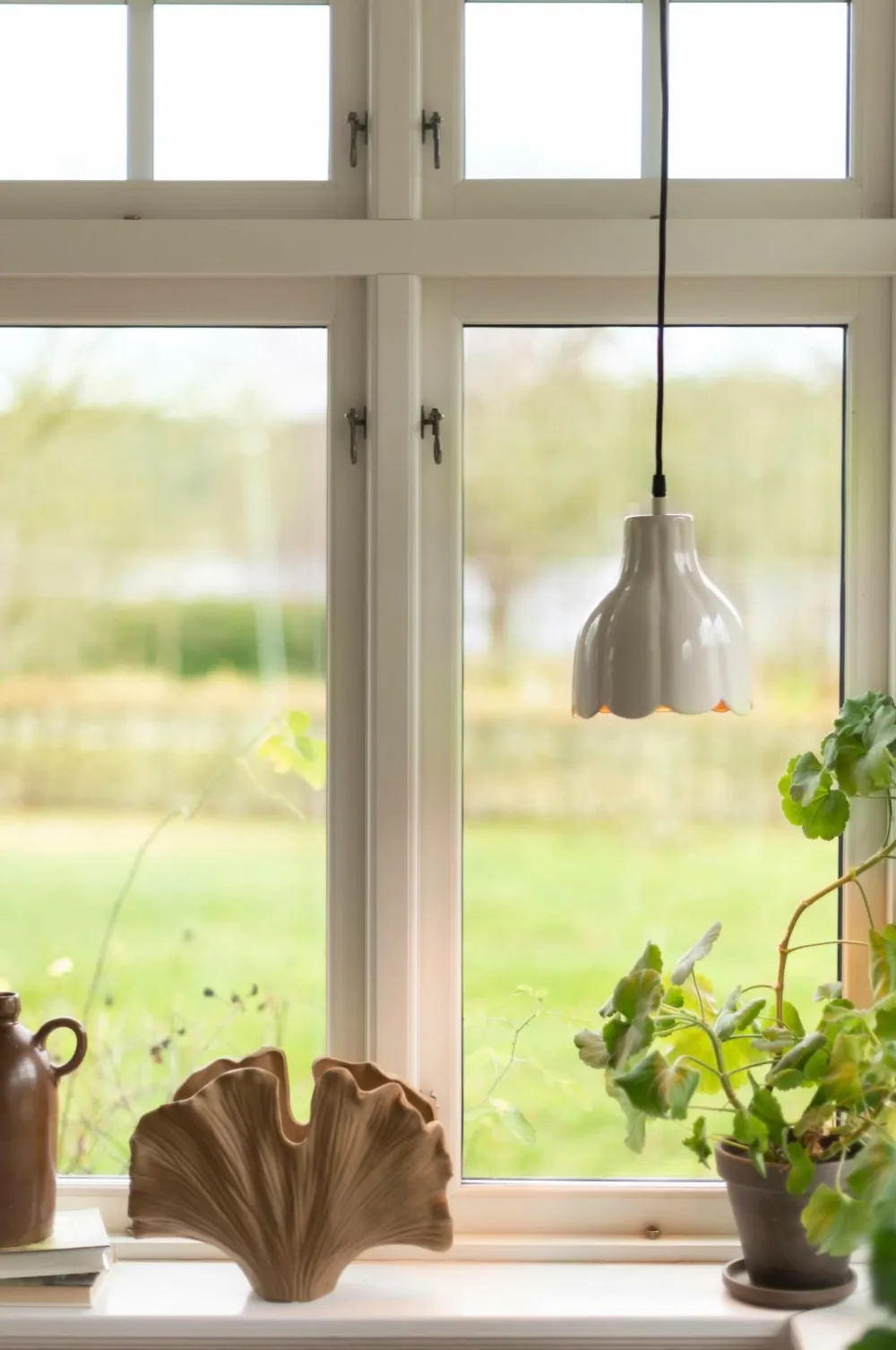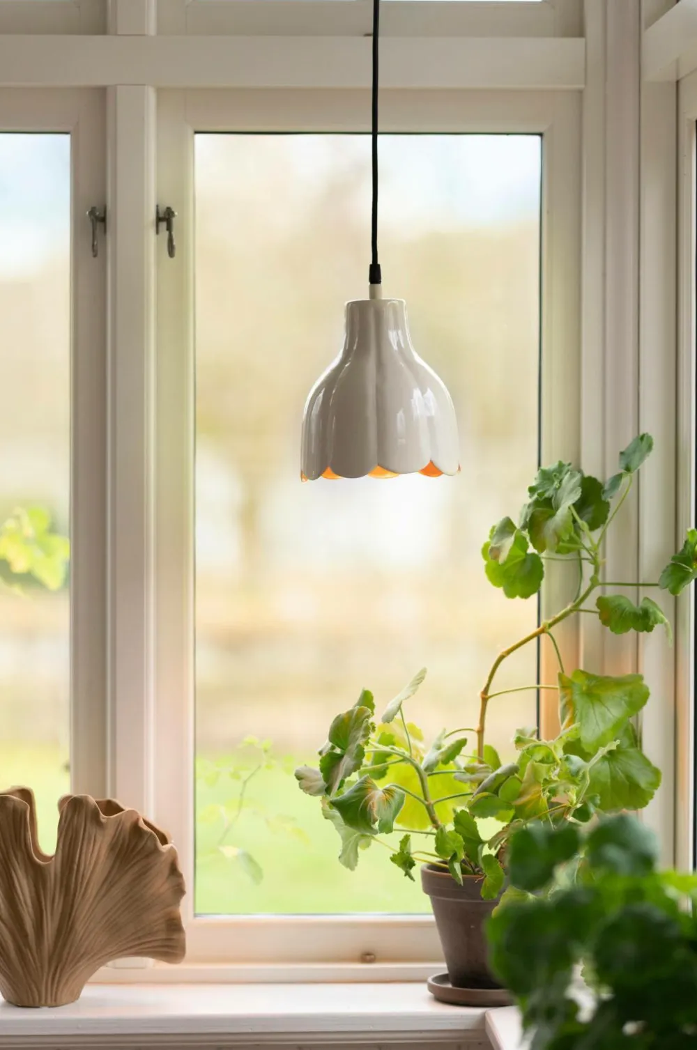 Loft/vindueslampe Tulippa i metal. Inspirationen til lampen kommer fra en tulipan baseret på Carl Larssons malerier og have. Hver lampe er håndlavet. Højde 20 cm og diameter 17 cm. Stofledning 3,5 m med stik. E27-sokkel. Maks. 25 W. IP20. Pære medfølger ikke.