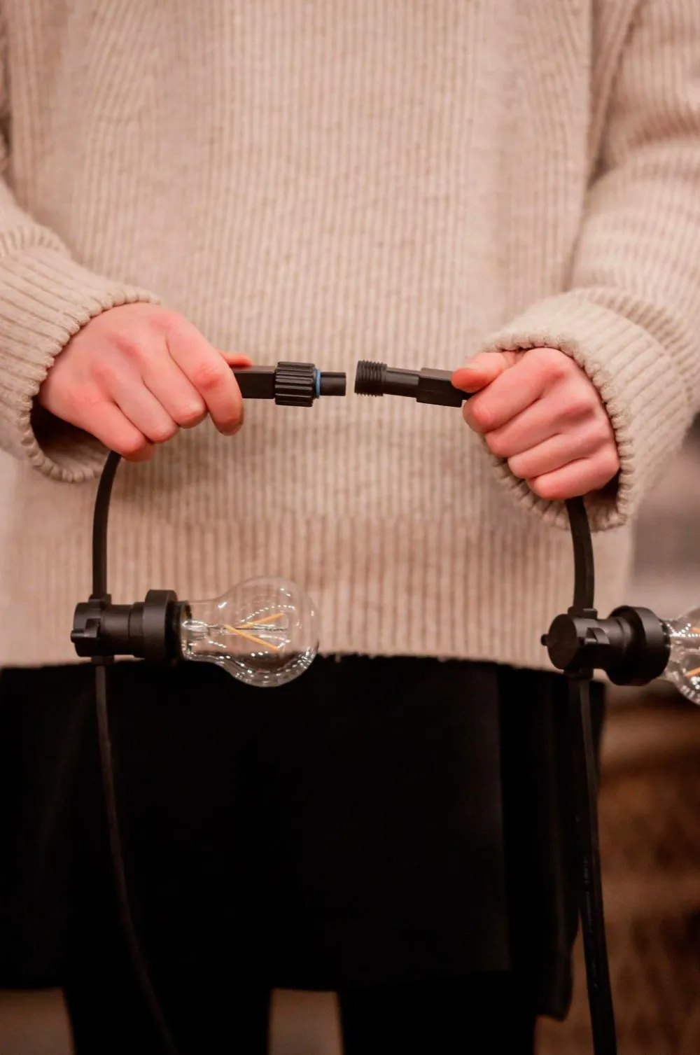 Bright lyskæde som add-on til startlyskæde. Denne er med et hanstik i den ene ende og et hunstik i den anden. Samlet længde 4,9 m. Fra hanstikket til den første lampeholder er der 20 cm, så er der 0,5 meter imellem dem. Efter den sidste lampeholder er der 20 cm ledning til hunstikket. Lyskæden sælges uden pærer. Belastning på hver fatning er maks. 15 W. Du kan købe de pærer, du kan lide, og nemt ændre udseende på lyskæden. I vores sortiment finder du mange forskellige LED-lyskilder som passer i denne lyskæde. CE- og IP44-mærket.