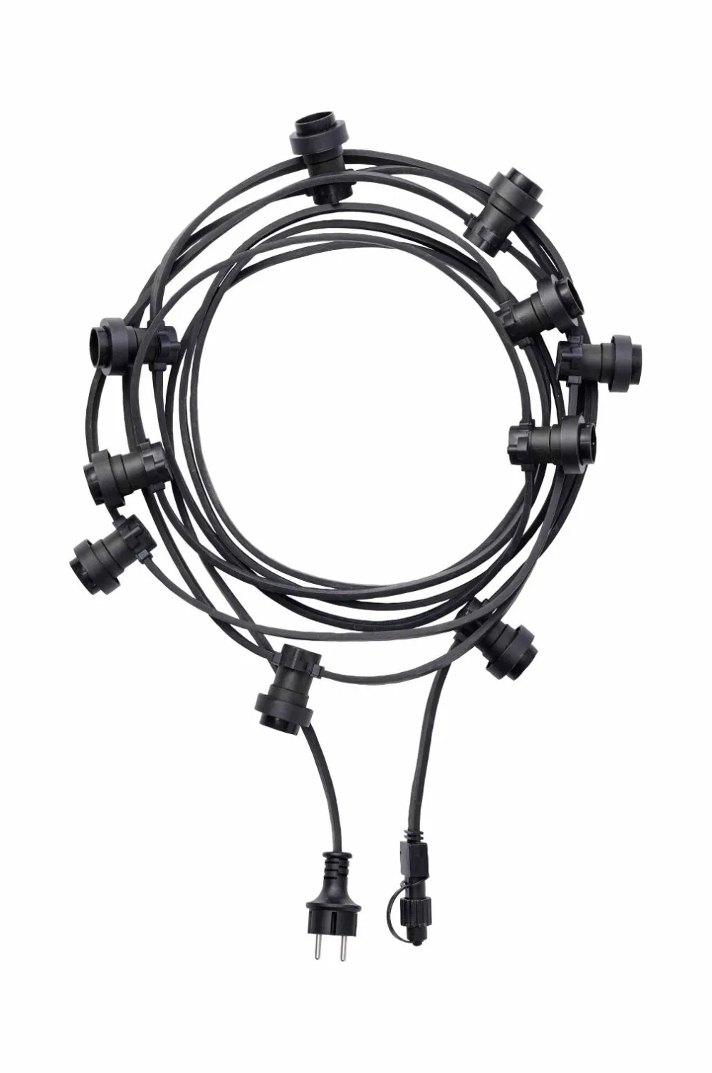 Populære Bright lyskæde nu i ny udførelse med mulighed for udvidelse! Denne lyskæde er i basisversionen med 10 E27-lampeholdere. Den har et 230 V-stik på den ene side og et hunstik på den anden side til tilkobling af flere lyskædemoduler, hvis det ønskes. Denne startlyskæde er i alt 7,2 meter lang, og der er 2,5 meter fra stikket til den første lampeholder. Derefter er der 0,5 meter imellem dem. Efter den sidste lampeholder er der 20 cm til hunstikket. Du kan maksimalt tilslutte yderligere 9 moduler med 10 lampeholdere hver. På den måde kan du få et sammenkoblet system med maks. 100 lampeholdere. Lyskæden sælges uden pærer. Belastning på hver fatning er maks. 15 W. Du kan købe de pærer, du kan lide, og nemt ændre udseende på lyskæden. I vores sortiment finder du mange forskellige LED-lyskilder som passer i denne lyskæde. CE- og IP44-mærket.