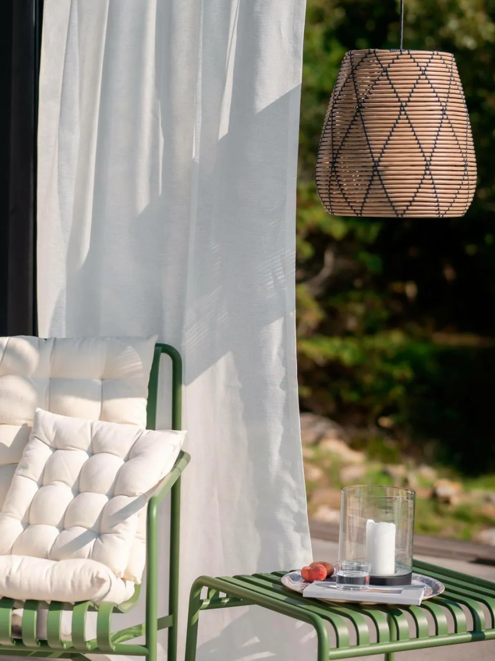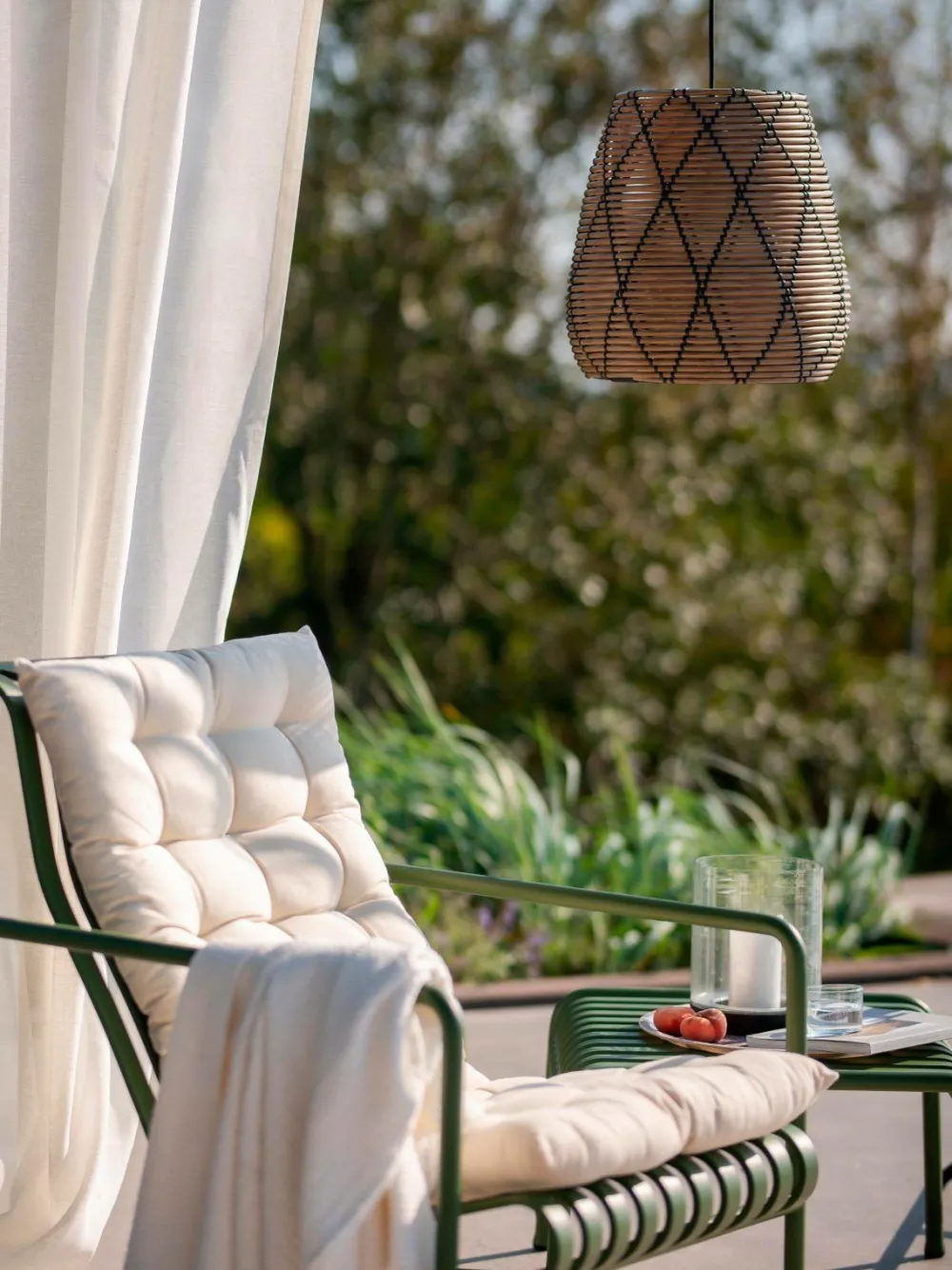 Lollo, en udendørslampe i kraftigere naturfarvet kunstrotting flettet med et mønster i sort. Kunstrotting er et robust materiale, som tåler vejr og vind. Den flettede struktur skaber et smukt lysspil. Diam. 38 cm. Højde 40 cm. Loftskærmen sælges sammen med Flex Out ophæng 2,5 m. IP44 til udendørs brug. E27 fatning, maks. 15 W. Jordet vægstik. Pære medfølger ikke.