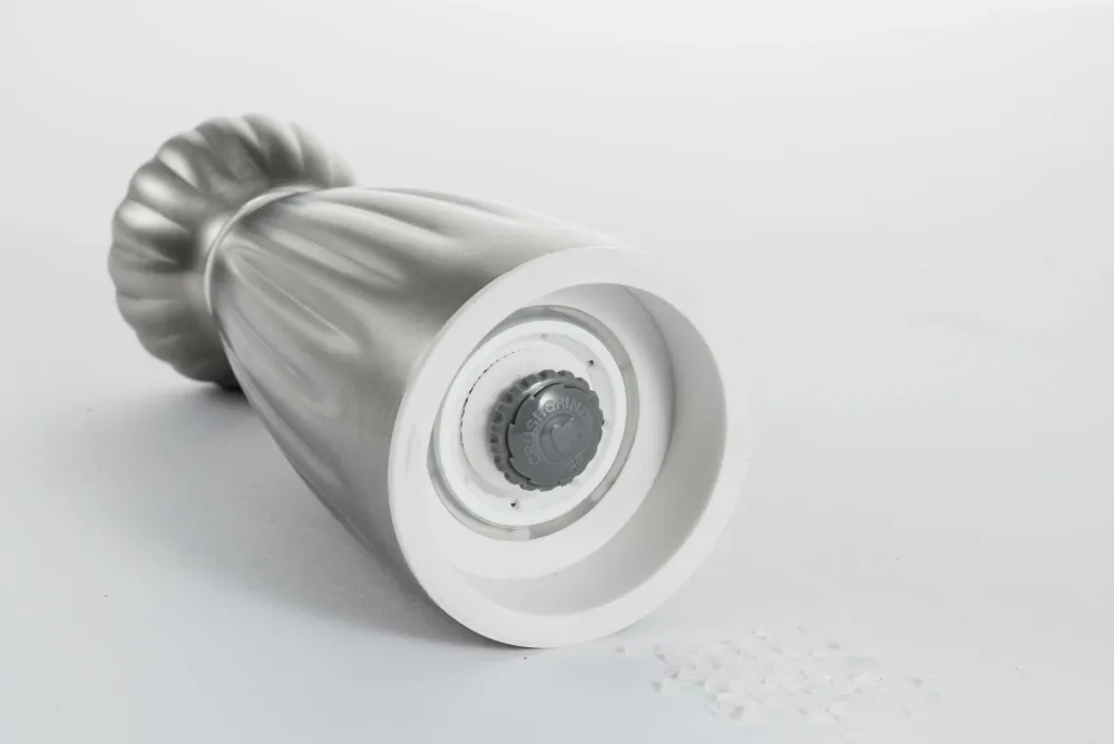 Kværnen har en hvid krave og bund, der tydeligt markerer, at det er en saltkværn. Den matchende palm bright medium peberkværn har sort krave og bund.