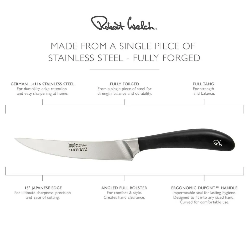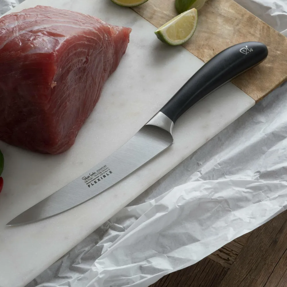 Den prisvindende signature 16 cm/6,5″ fleksible universalkniv er designet i samarbejde med professionelle kokke og har et smalt blad og en spids, der giver præcision.