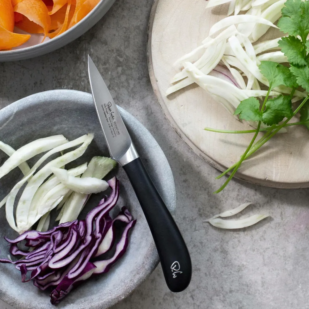 Den prisvindende signature 8 cm/3″ skrællekniv er designet i samarbejde med professionelle kokke og har et kort blad med almindelig kant, som er ideelt til at skrælle, trimme og skære frugt og grøntsager i skiver.