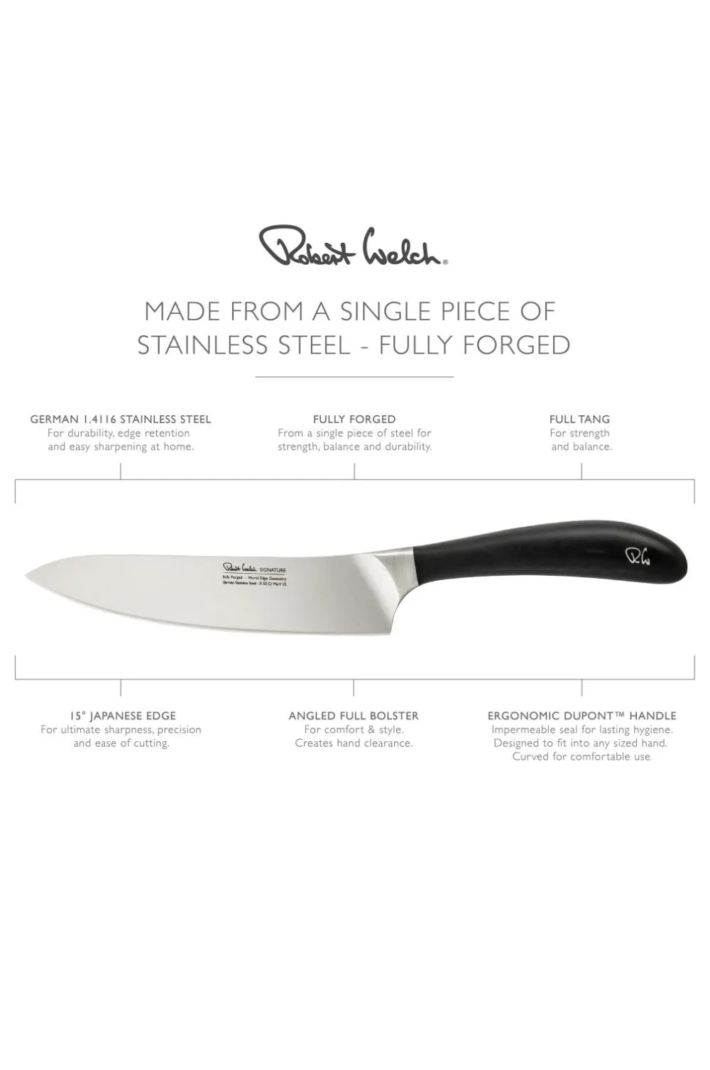Den prisbelønnede signature 18 cm/7,5″ kokkekniv er designet i samråd med professionelle kokke og er en køkkenkniv til alle formål med et buet blad til hakning og rokkende snit.