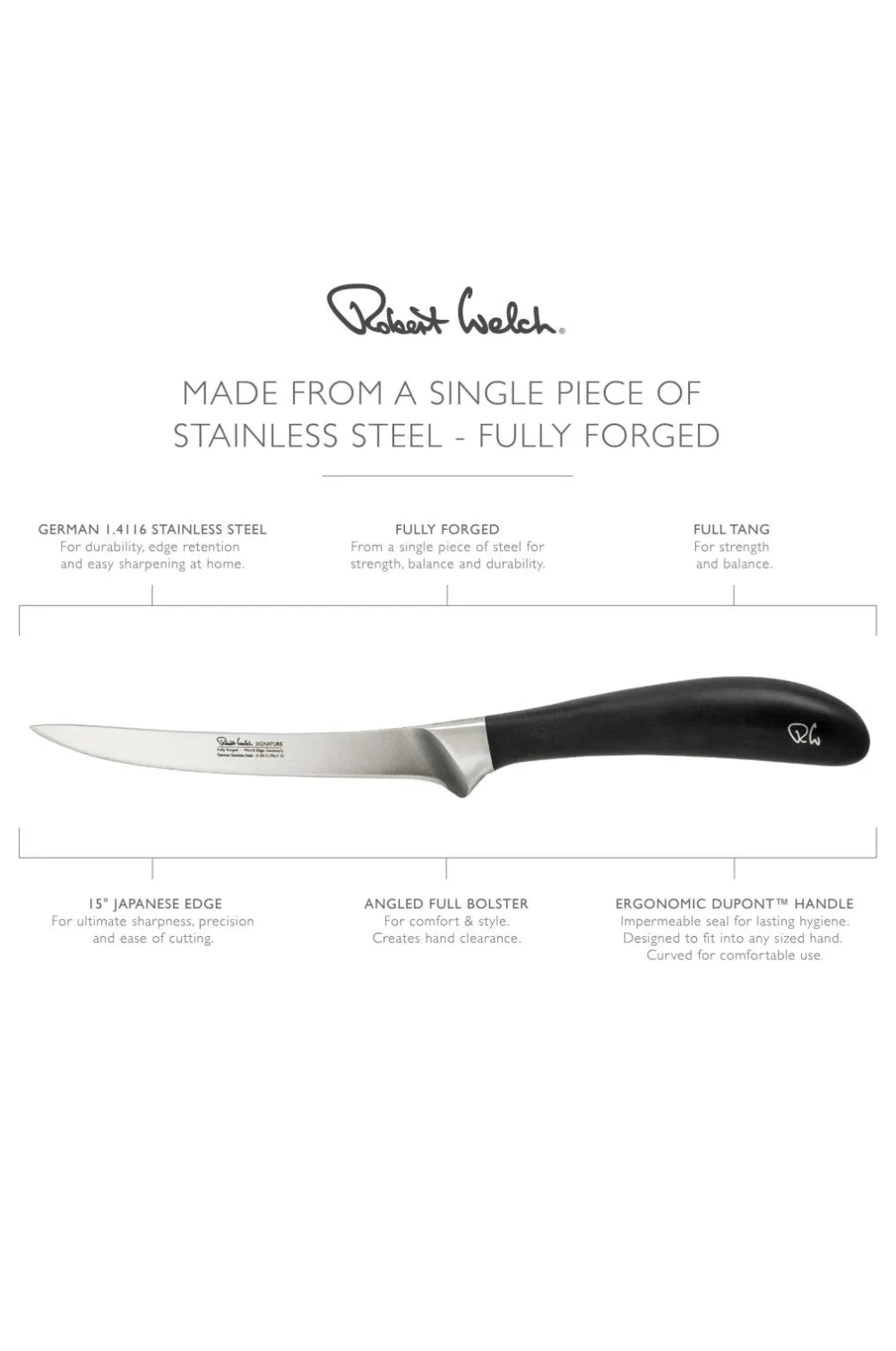 Den prisbelønnede signature 16 cm/6,5″ udbeningskniv er designet i samråd med professionelle kokke og har et smalt blad og en spids spids til præcis udbening af kød, fjerkræ og fisk.