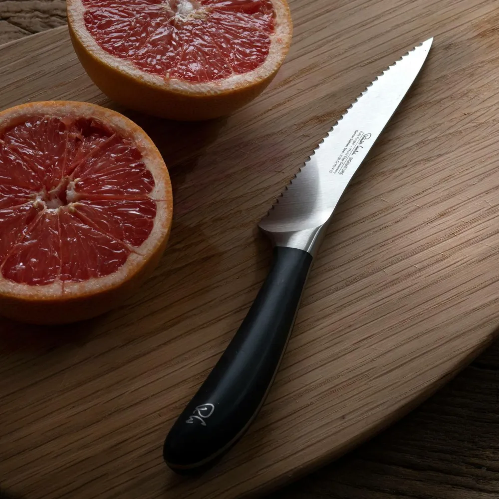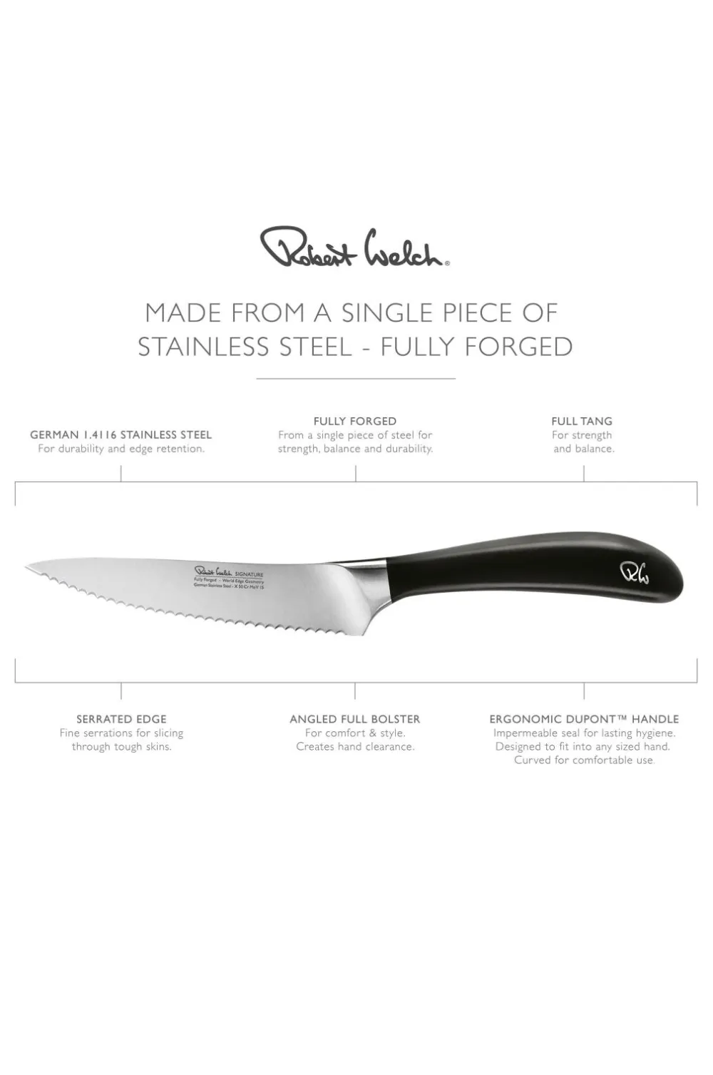 Den prisbelønnede signature 12 cm/4,5″ savtakkede universalkniv er designet i samråd med professionelle kokke og har en takket kant til at skære citrusfrugter og andre fødevarer med hård skorpe eller hård hud.