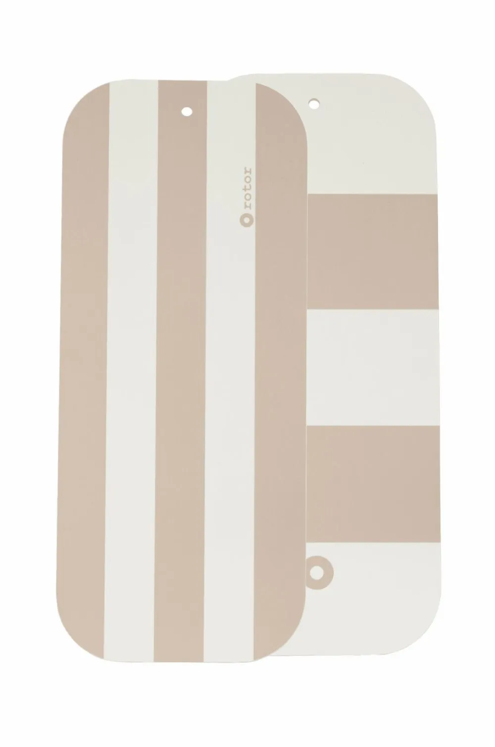 Vendbart skærebræt “stripes-blond by rotor” i beige og hvid med forskellige stribemønstre på for- og bagsiden. Dette praktiske skærebræt måler 40×17 cm og er fremstillet af slidstærkt mdf, hvilket sikrer både robusthed og nem vedligeholdelse. Et moderne must-have i køkkenet, omhyggeligt udformet i färjestaden.
