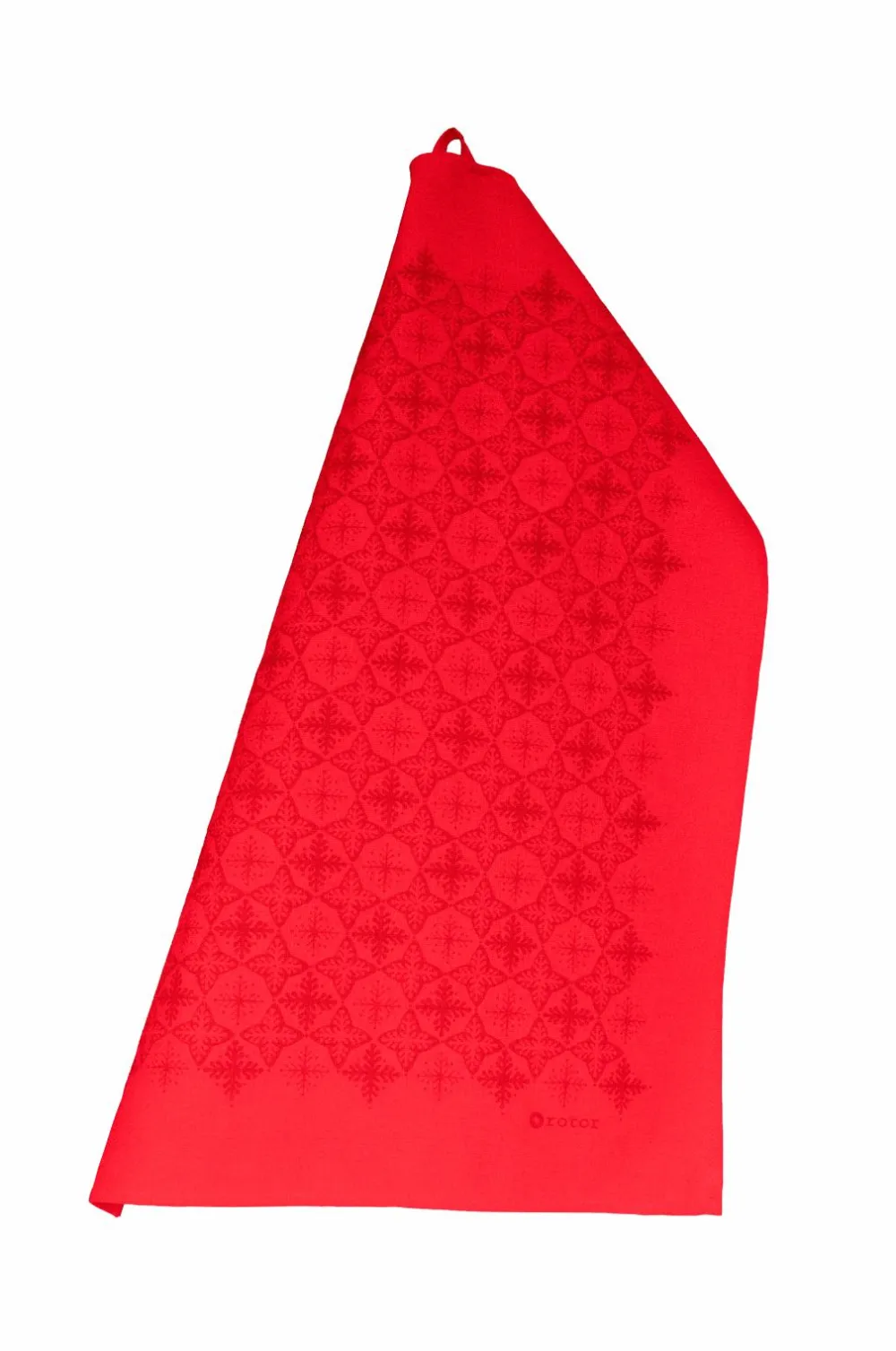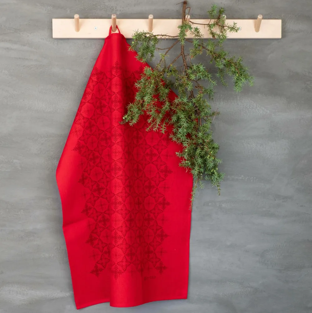 Rødt køkkenhåndklæde med mørkerødt “julstjärna”-print – et elegant og festligt håndklæde til alle dine juleanledninger. Fremstillet af en blanding af 50 % bomuld og 50 % hør for optimal kvalitet og følelse. Perfekt til at give dit køkken et varmt, julet præg.