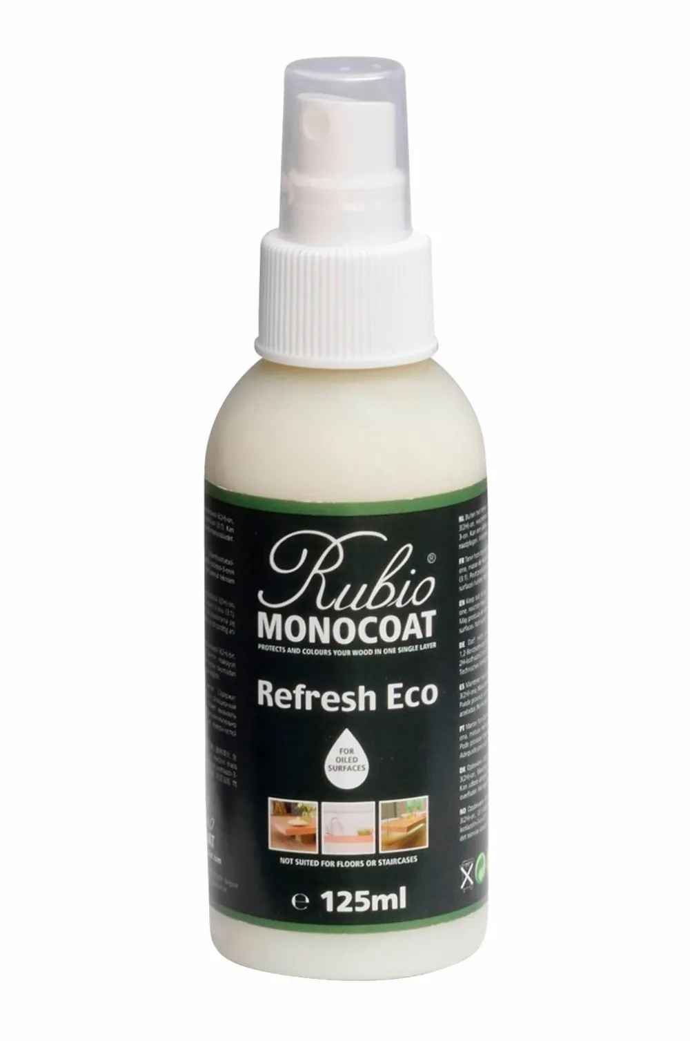 RUBIO Monocoat Refresh Eco 125 ml sprayflaske er et færdigblandet produkt, der opfrisker og restaurerer alle træoverflader, der er behandlet med olie. Pigmentfri emulsion, der kan bruges flere gange om året.
