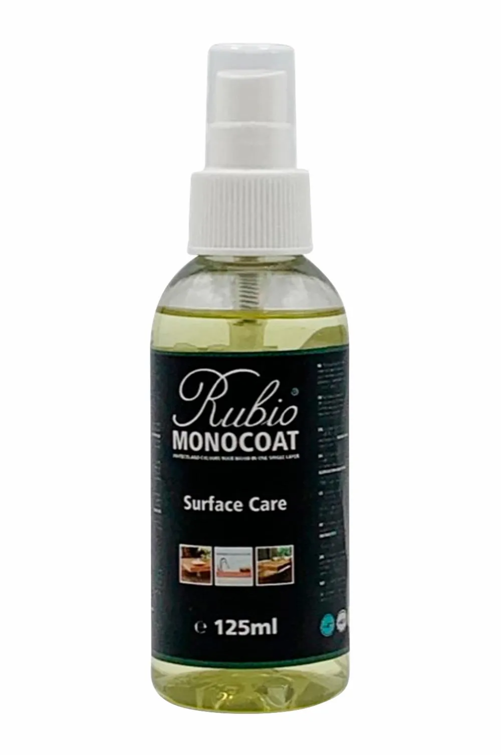 RUBIO Monocoat Surface Care 125 ml sprayflaske er et praktisk og færdigblandet rengøringsmiddel til regelmæssig rengøring af oliebehandlede overflader. Rengøringsmidlet fjerner snavs og fedt grundigt uden at påvirke træets naturlige matte farve. Vi anbefaler, at du derefter bruger RUBIO Monocoat Refresh Eco som afsluttende behandling, hvis det er nødvendigt.