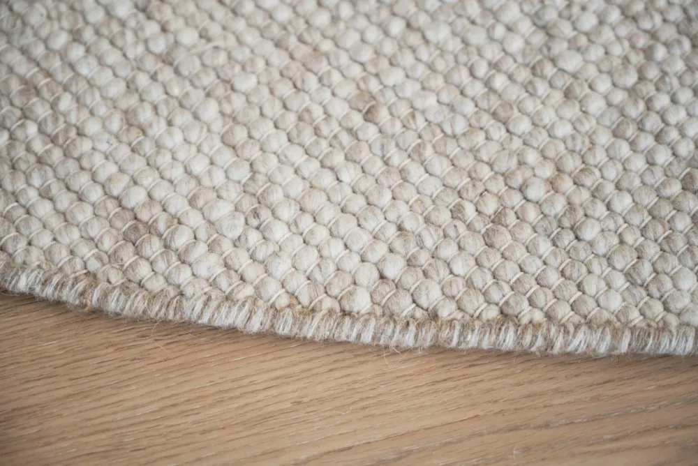 Auckland-tæppet ø250 cm i beige uld er et slidstærkt, håndvævet tæppe af høj kvalitet. Det er lavet af 100 % uld og er varmt og behageligt at gå på. Auckland fås i flere størrelser og er takket være sine naturlige farver let at placere i forskellige rum i dit hjem. Det anbefales at bruge et tæppeunderlag. Den fås også i naturfarver og grå. Til loungesofaen Willard kan du købe et hjørnemodul for at skabe en hjørnesofa. Her er den betrukket med det smukke og trendy bouclé-stof alice light beige (#01). Designet er blødt og afrundet og giver en varm og indbydende følelse.