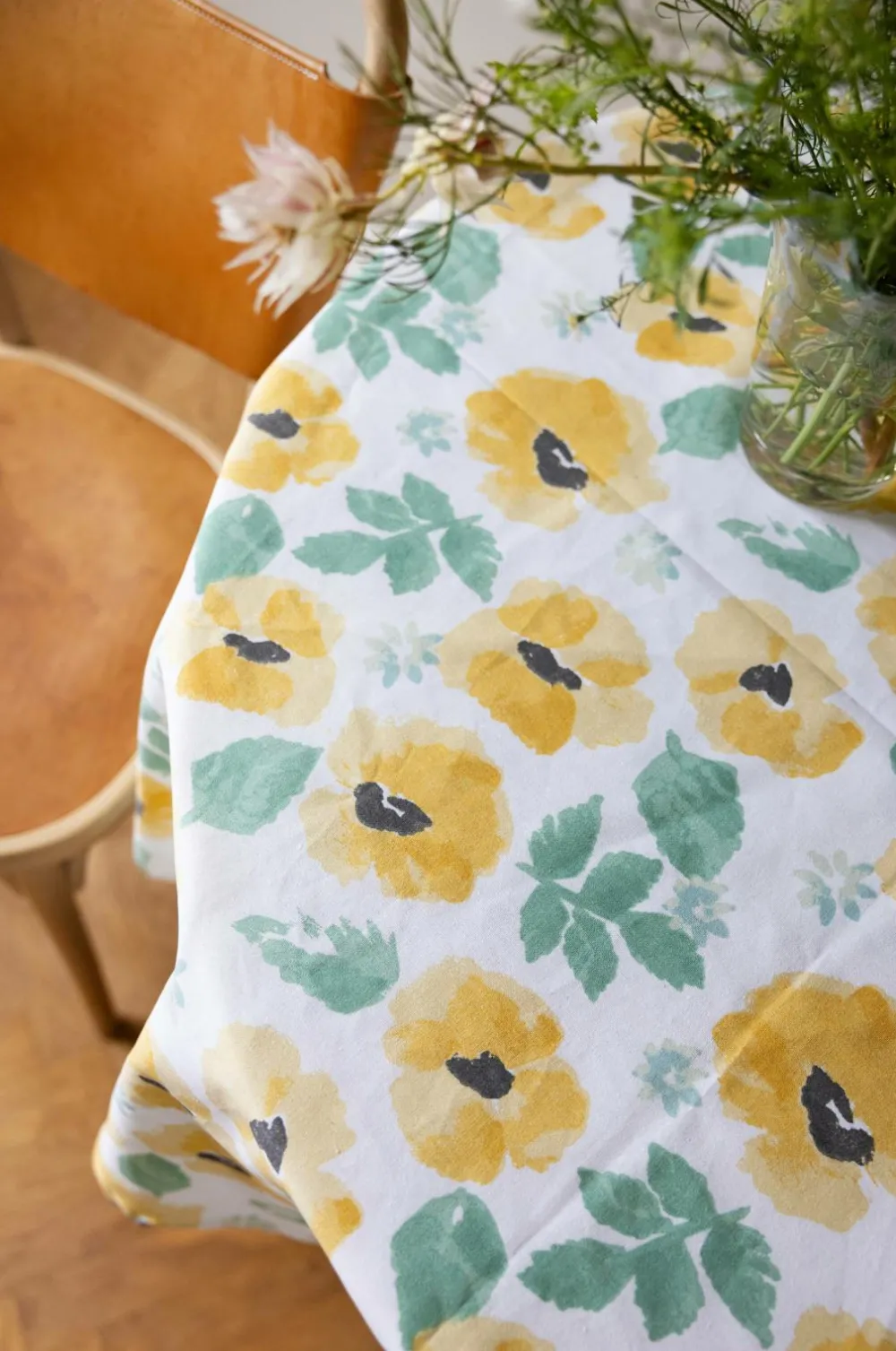 Eden voksdugen er smukt mønstret og fremstillet af 70 % genbrugsbomuld og 30 % genbrugspolyester. Den voksbehandlede overflade gør den vandafvisende og perfekt til både udendørs og indendørs brug. Mønsteret består af omhyggeligt designede, malede blomster i bløde pastelfarver som gul, grøn og beige. Fås i størrelsen 180×180 cm. Pakket med et smukt papiromslag.