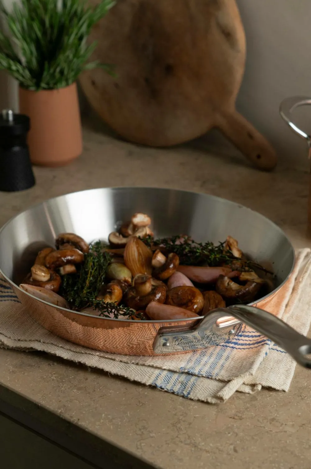 Alt kobberinduktionskogegrej har en rustfri stålbund, hvilket gør det velegnet til alle varmekilder. Serien omfatter alt fra stegepander til sauterpander og bradepander, så du kan roligt investere i flere retter. De er designet til at komplementere hinanden og tilføje en gylden glans til dit hjem. Du kan roligt hænge retterne op eller opbevare dem på en hylde i køkkenet, hvor de kan ses.