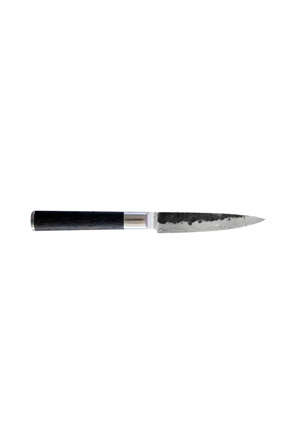 Kuro er en groft hamret kniv med vg-10 stålklinge, der er bearbejdet otte gange, hvilket giver den ekstra skarphed og en hårdhed på omkring 58 hrc. Det lange brændte træhåndtag med bolster og 18/8 stålskaft giver perfekt greb, balance og stabilitet.
