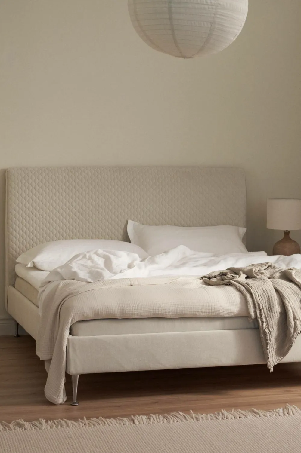 GÅVA, sengen designet til et helt liv – konstruktionen giver en lang række muligheder for at ændre komfort og stil. En Softbed er en seng med indbygget hovedgærde, hvor du kan vælge din komfort. Alt sammen for at passe til din livsstil. At kunne opgradere, renovere og reparere din seng er en vigtig bæredygtig forpligtelse, da det forlænger din sengs levetid. Designet giver dig også mulighed for at genbruge din seng. Vi tilbyder 25 års garanti på fjederbrud. Sengen består af en ramme lavet af gran, der er dækket af et blødt stof af 100 % polyester. Kassetterne er en 17 cm høj 3-zonet lomme. Du får ekstra støtte i midten, hvor kroppen er tungest, samtidig med at skuldre og nakke aflastes. Benene er af metal i et elegant design, 19 cm. Topmadras, piqué med en kerne af hyperblødt skum, omviklet med 4-kanals hulfibervat, der leder fugt og varme væk. Madrassen er piqué, hvilket betyder, at betrækket ikke kan fjernes, men det skaber en blød overflade.