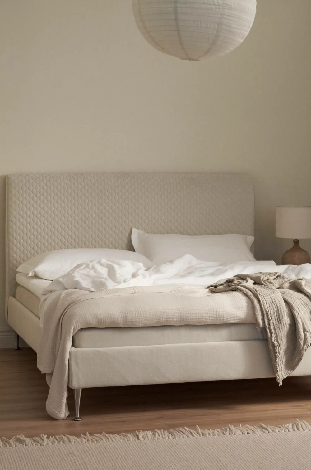 VIGGO, sengen designet til et helt liv – konstruktionen giver en bred vifte af muligheder for at ændre komfort og stil. En Softbed er en seng med indbygget hovedgærde, hvor du kan vælge din komfort. Alt sammen så det passer til din livsstil. At kunne opgradere, renovere og reparere din seng er en vigtig bæredygtig forpligtelse, da det forlænger din sengs levetid. Designet giver dig også mulighed for at genbruge din seng. Vi tilbyder 25 års garanti på fjederbrud. Sengen består af en ramme lavet af gran, der er dækket af blødt stof af 100 % polyester. Kassetterne er 22 cm høje chesspocket, hvor hver anden spiral er 16 cm høj og hver anden er 18 cm høj. Det giver en blød og hyggelig følelse. Benene er af metal og 19 cm høje. Madrassen består af en kerne af hyperblødt skum, der er omviklet med 4-kanals hulfibervat, som leder fugt og varme væk. Topmadrassen er piqué, hvilket betyder, at betrækket ikke kan tages af, men det giver en blød overfladefornemmelse.