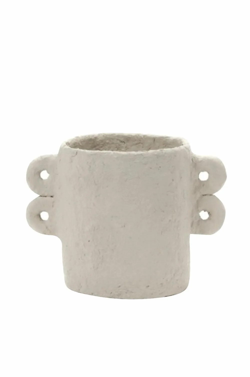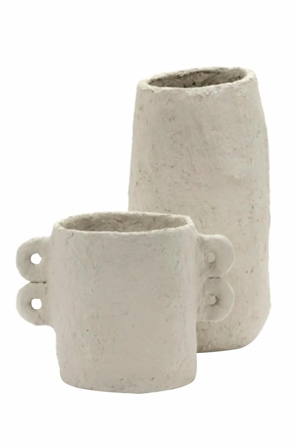 Høj og smal eller lille og rund, med store eller små hanke – hvoraf den ene kan være lidt lavere end den anden – ingen krus i papmaché-kollektionen på marie michielssen er ens. Materialets tydeligt synlige grove struktur, de udvalgte farver og de manuelt prikkede tryk forstærker hver kandes individualitet med alle dens ufuldkommenheder, ligesom naturen gør det i sine kreationer.