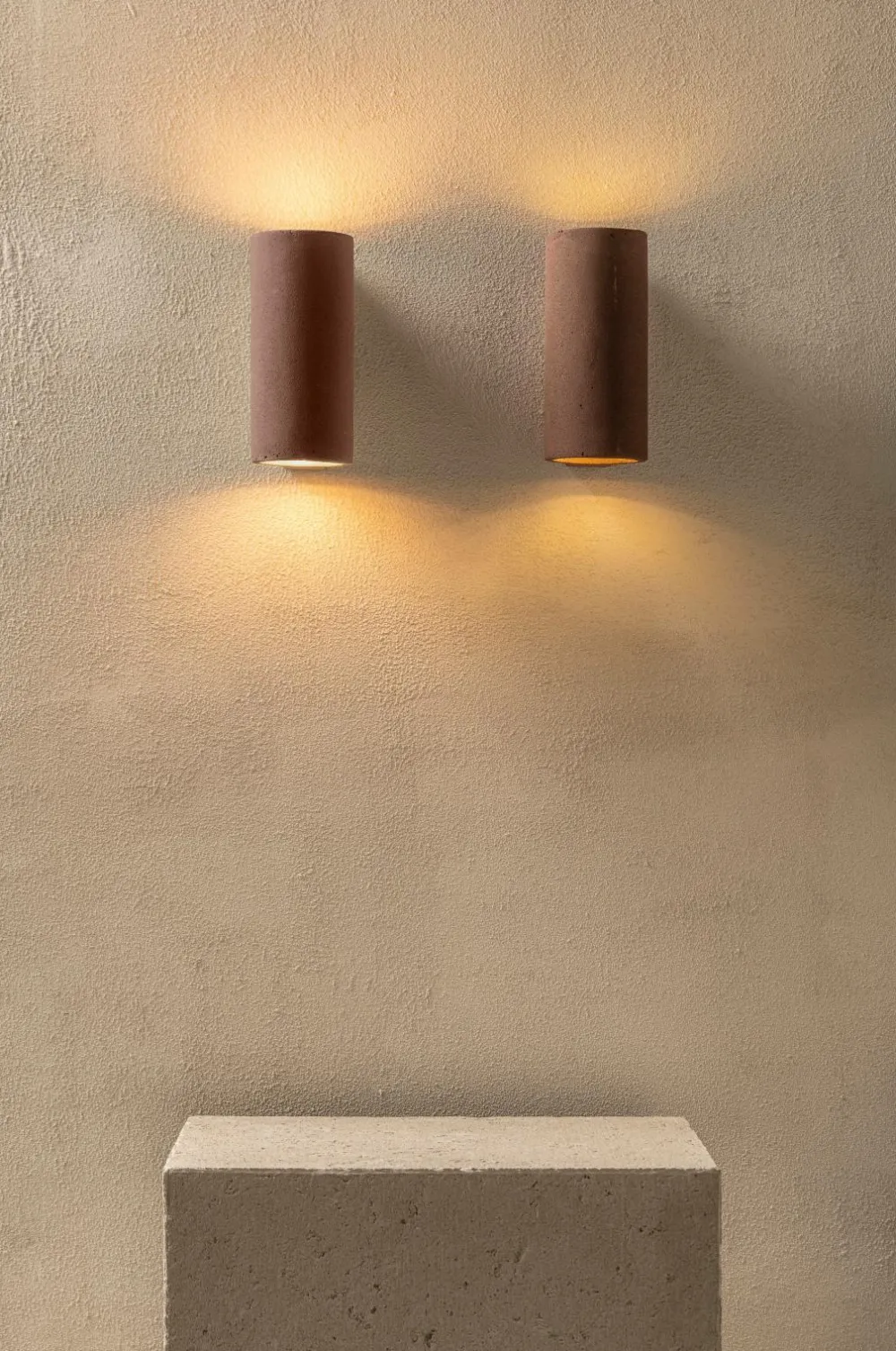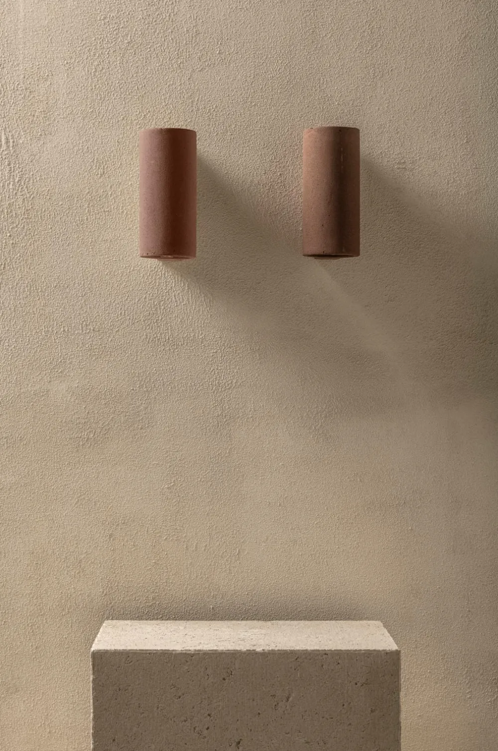 Arkitekten thijs prinsen , der er drivkraften bag lens°ass architects, har noget med mursten. I en renovering, hvor gamle mursten blev genbrugt i overflod, opstod ideen om at designe vægbelysning med samme rektangulære shape. Hans valg faldt på farvet beton i to nuancer og terracotta til at realisere designet. Kegle- og cylinderformerne er varianter og specifikt valgt for at imødekomme efterspørgslen efter karakterfuld omgivelsesbelysning, som oplyser vægge og gulv på en pæn måde.