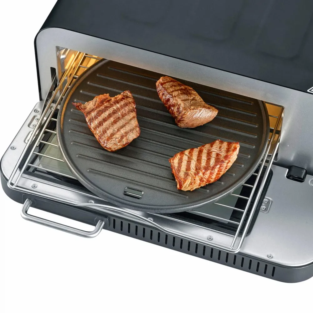 • Inkluderer en pizzasten for en autentisk stenovnseffekt.