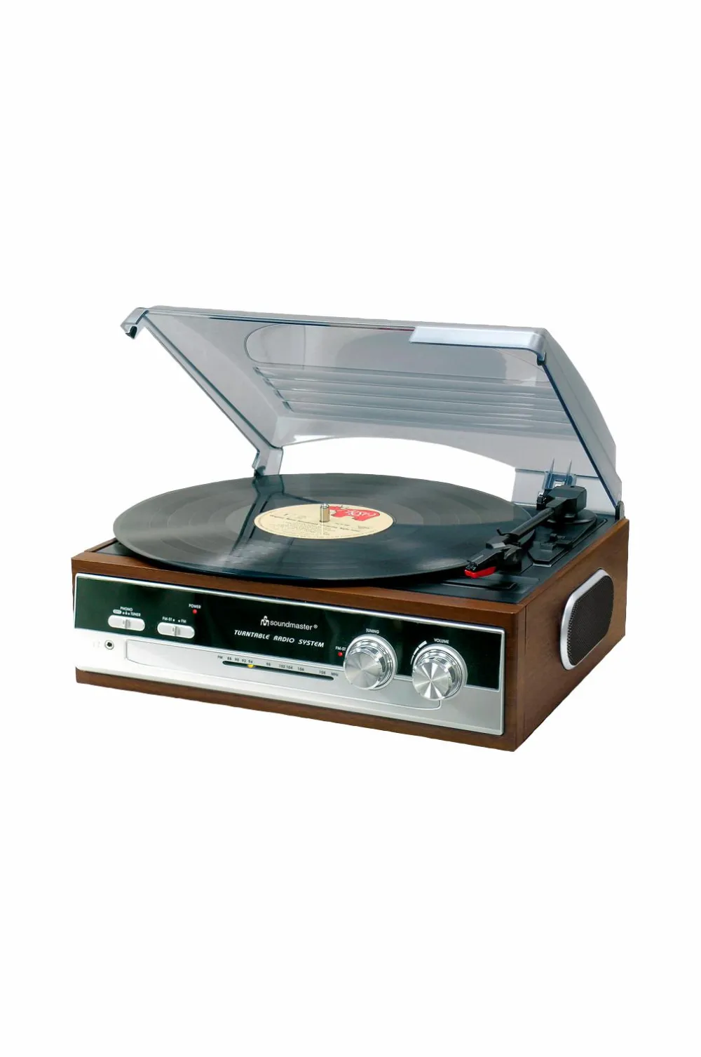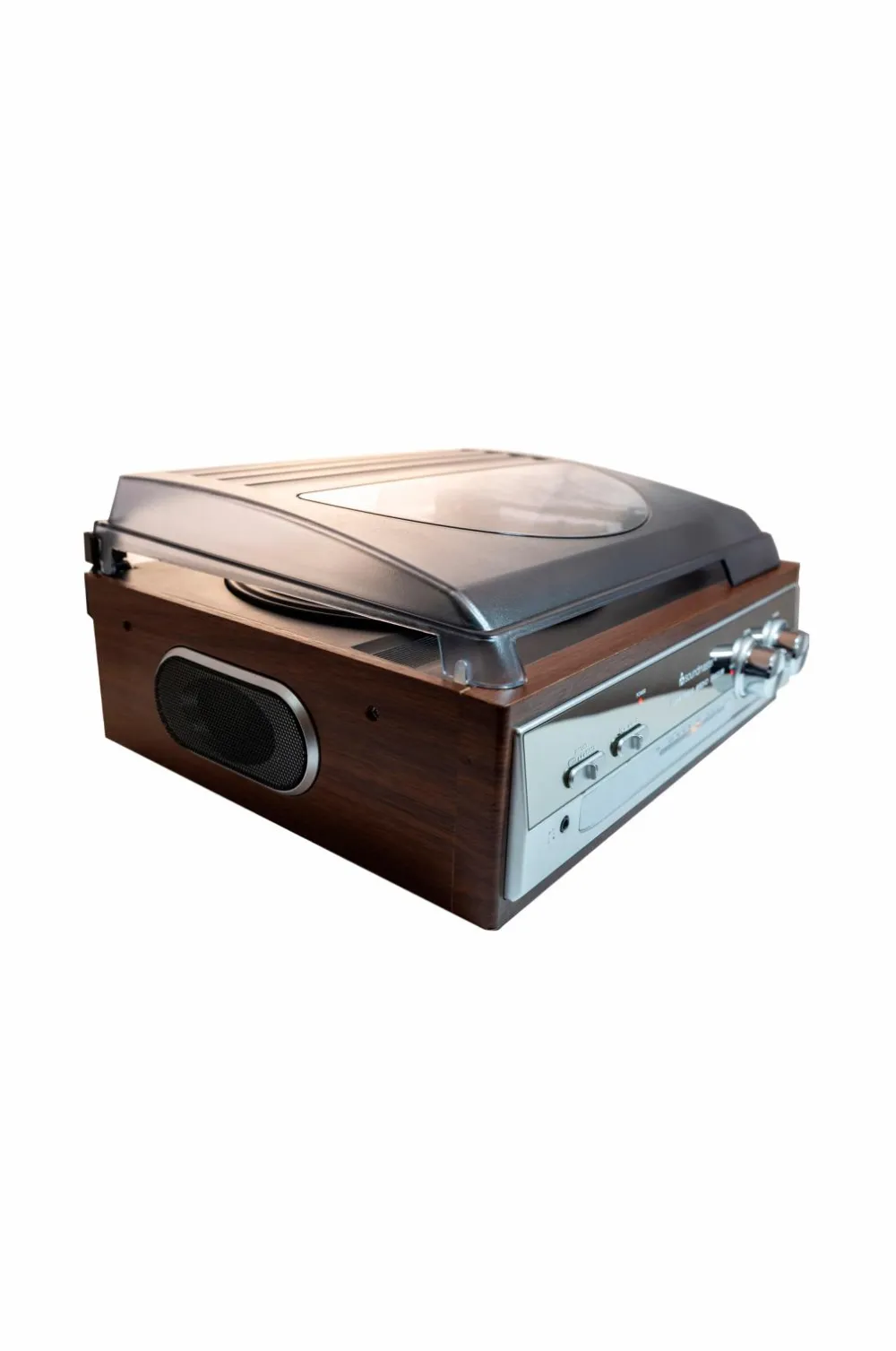 Et lille stereoanlæg i 70’er-design med pladespiller, radio og indbyggede højttalere.