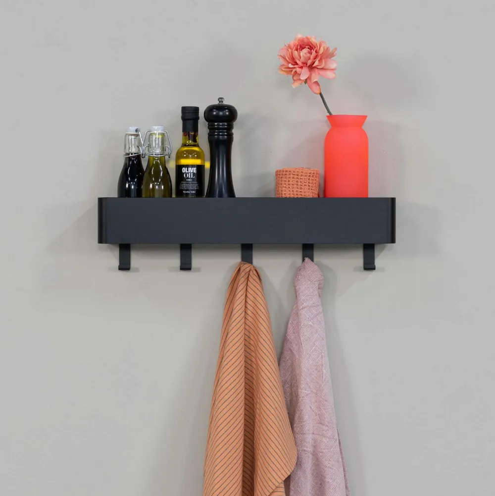 Multi 5 er usædvanligt alsidig! Det skyldes, at den både er en væghylde og en knagerække i ét praktisk design. Den er en perfekt tilføjelse til din entré, dit køkken eller dit badeværelse. Læg nøgler, køkken- eller badeværelsesredskaber på den øverste hylde, og hæng tøj, redskaber eller håndklæder på de tilgængelige kroge. Multi fås med 3, 5 eller 7 kroge og i forskellige farver.