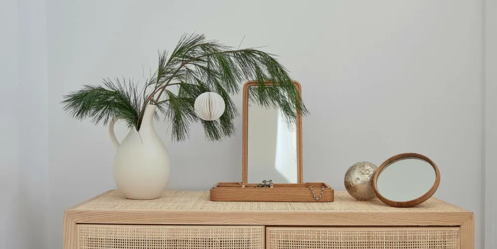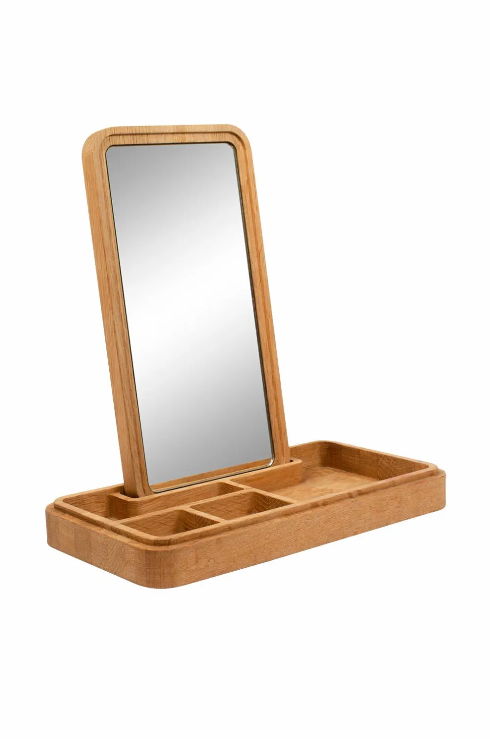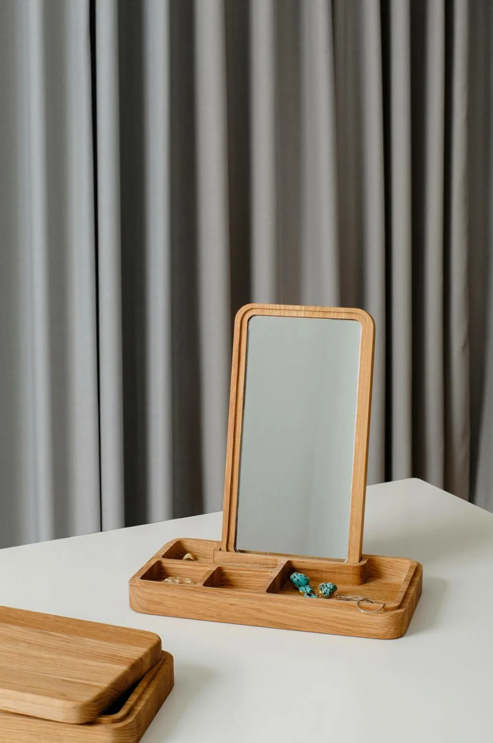 Smykkeskrin med spejl i låget. Skrinet har flere rum til smykker, makeup, ure og andre dyrebare småting. Eller stil det i entreen som opbevaring til nøgler og pung. Spejlet løftes nemt af og bruges som låg, når du vil gemme dine ting. Design af Grounded Craftwork. Materiale: FSC-mærket eg Mål: 5,2x17x32 cm. Vægt: 1,435 kg. Håndlavet. Rengøres med en fugtig klud. Vedligehold lejlighedsvis ved at smøre med bivoks.