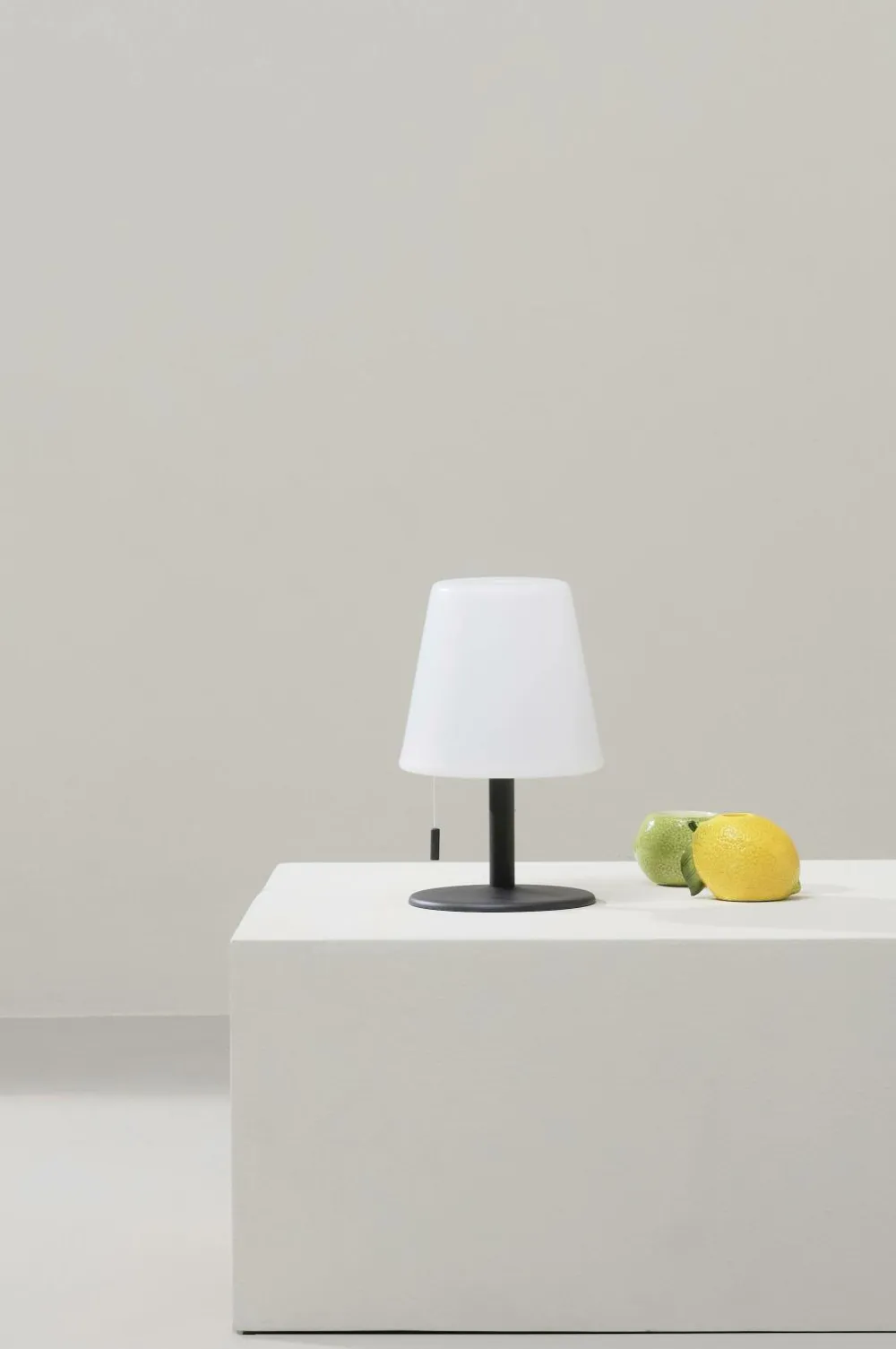 Stilren bærbar bordlampe med USB til udendørs brug. Lampen spreder et hyggeligt varmt hvidt lys, som du kan justere til svagt eller skarpt lys ved at trække i den hængende snor. En dejlig lampe, der giver et behageligt ekstra lys i varme sommeraftener i haven eller på altanen. Hvidt LED-kabel til opladning, ledningslængde 1 meter. Drives med 1 genopladeligt Li-Ion-batteri. Batterier medfølger.