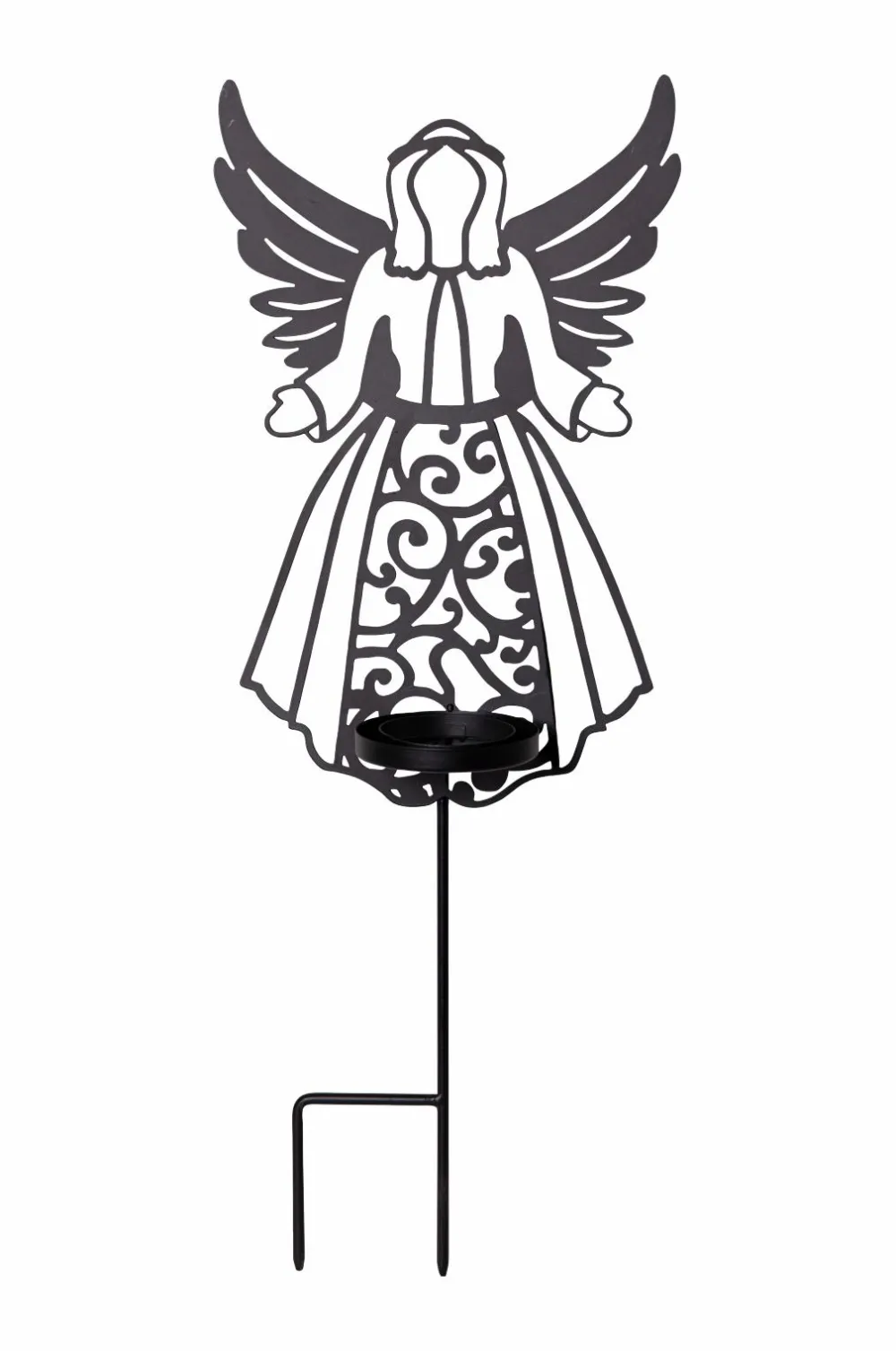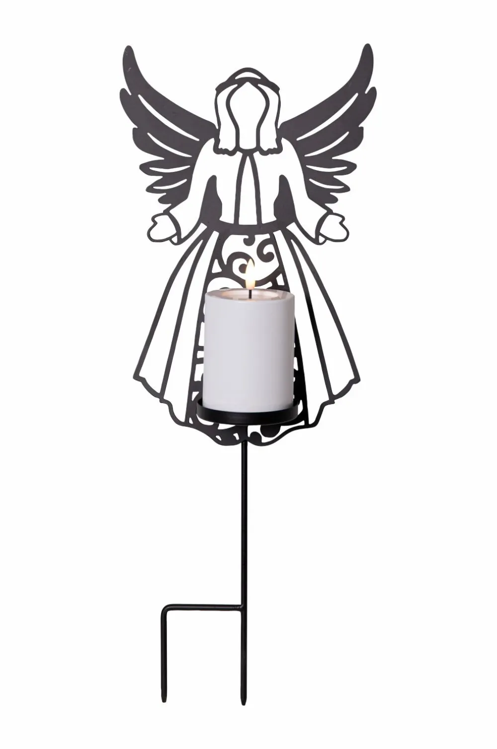 Flamme deco er en silhuet i form af en engel, hvor et batteridrevet lys lyser op med en varm hvid flamme. Det vil være en smuk dekoration i din have eller på et mindested eller en grav. Lyset har en ekstra lang brændetid på ca. 2500 timer og drives af 2 c-batterier, som ikke medfølger.
