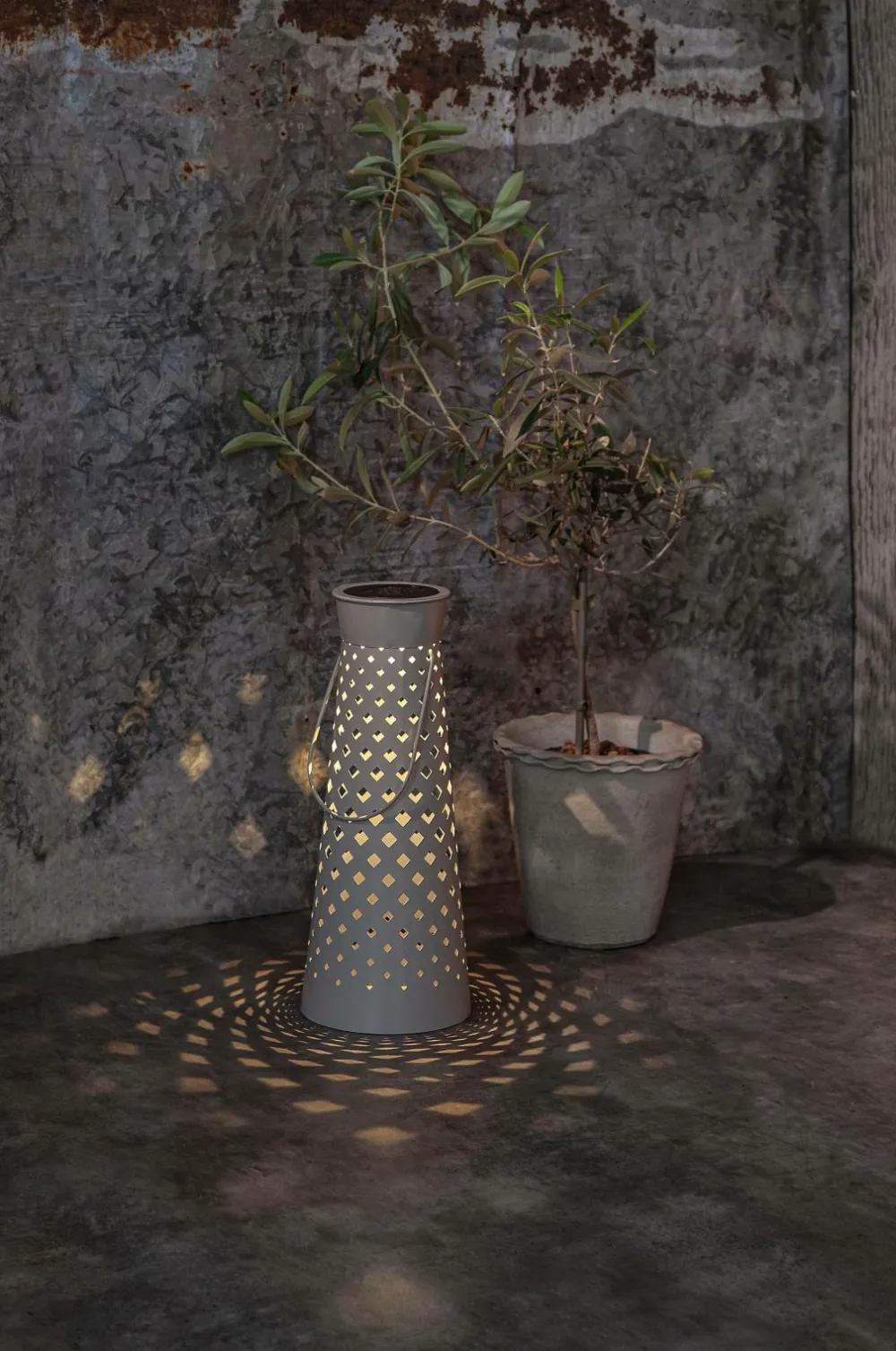 Vores fine lanterne Romby er en solcellebelysning lavet i gråt metal. Det varme hvide lys skinner smukt gennem det udstansede rombemønster og danner et smukt lysbillede. Lygten er fin at stille i din have eller på en altan. Placer den, hvor solen kan nå panelerne i løbet af dagen for at få den ultimative opladning af det medfølgende batteri.