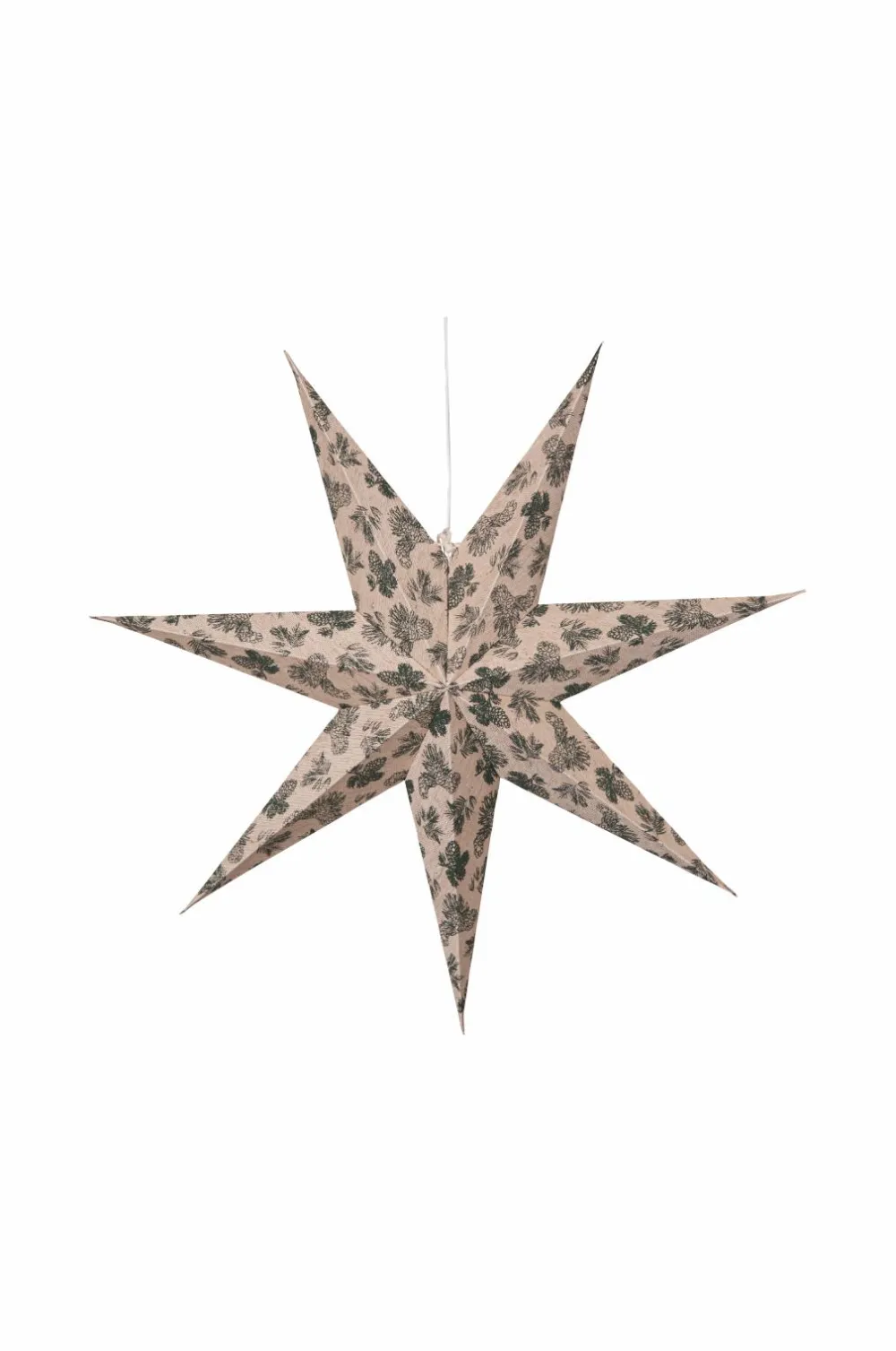 Papirstjerne med fsc®-mærke. Den klassiske adventsstjerne har et flot vinterligt mønster i grønt med kogler og grannåle. Pynt op til advent, og det giver en dejlig julestemning. Køb til ledningsstativ og lyskilde for at få lys i stjernen.