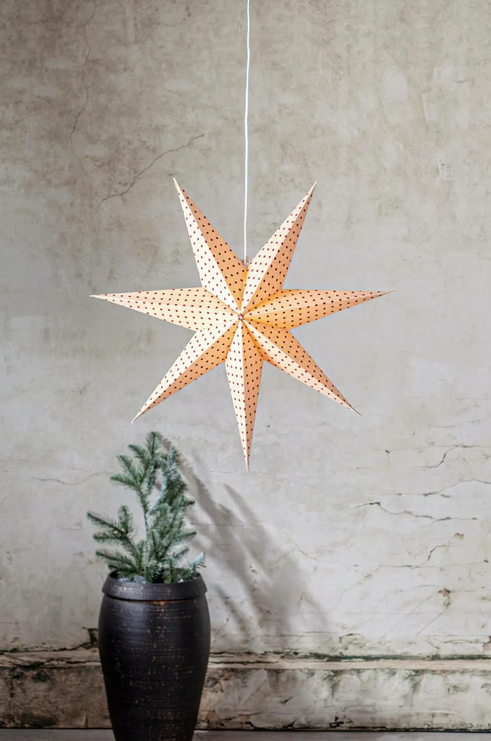 Papirstjerne dækket med stof for den perfekte følelse af natur. Moderne adventsstjerne til at dekorere et vindue eller læne op ad en væg. Pynt op til advent, og det giver en vidunderlig julestemning. Køb et ledningsstativ og en lyskilde for at få lys i stjernen. Diameter 60 cm.