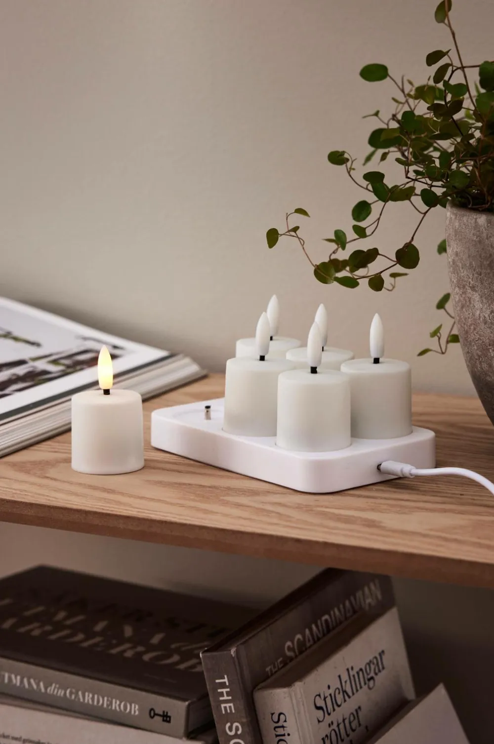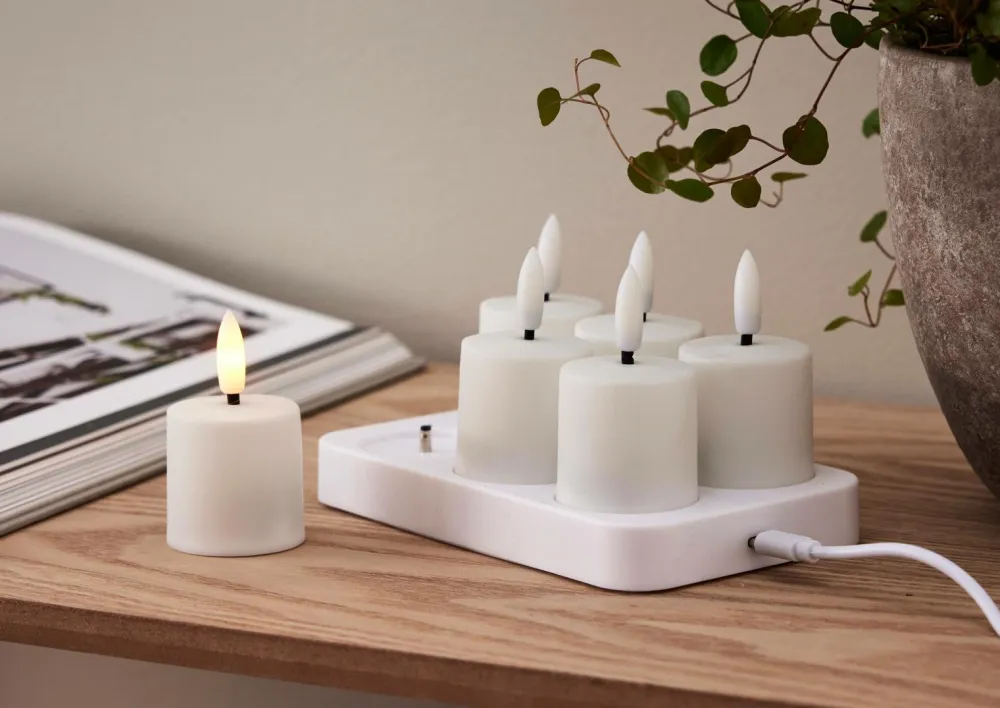 Flamme charge er et sæt med 6 hvide votivlys på 4×6 cm, som er genopladelige. Den tilhørende opladningsplade har også et medfølgende 80 cm langt kabel med usb a-usb c-stik, som nemt kan tilsluttes en 5v-adapter, adapteren medfølger ikke. Indikatorlyset på pladen lyser rødt under opladning og grønt, når lyset er fuldt opladet. Selv om litiumbatterierne har overopladningsbeskyttelse, må du ikke lade lysene oplade i mere end 5 timer! Når de er nye, er en opladning på højst 2 timer tilstrækkelig.