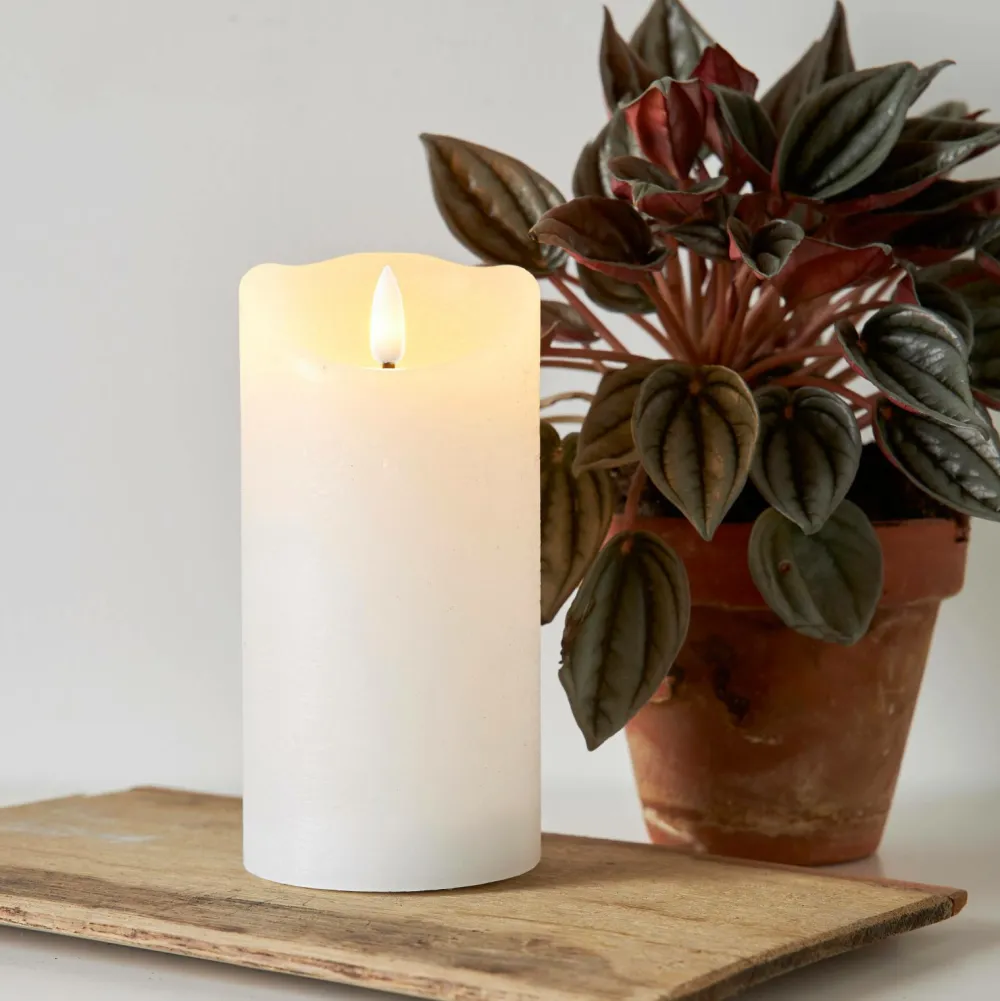 Hvidt vokslys med rustik overflade i vores flamme-serie. Den naturtro flamme skinner med en varm hvid glød. Med indbygget timer. Undgå at placere lysene i direkte sollys, da de kan smelte og blive misfarvede af varmen.