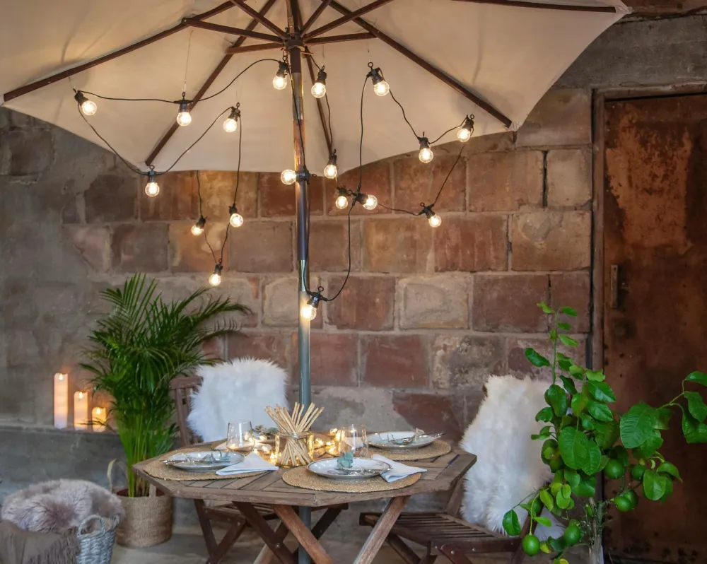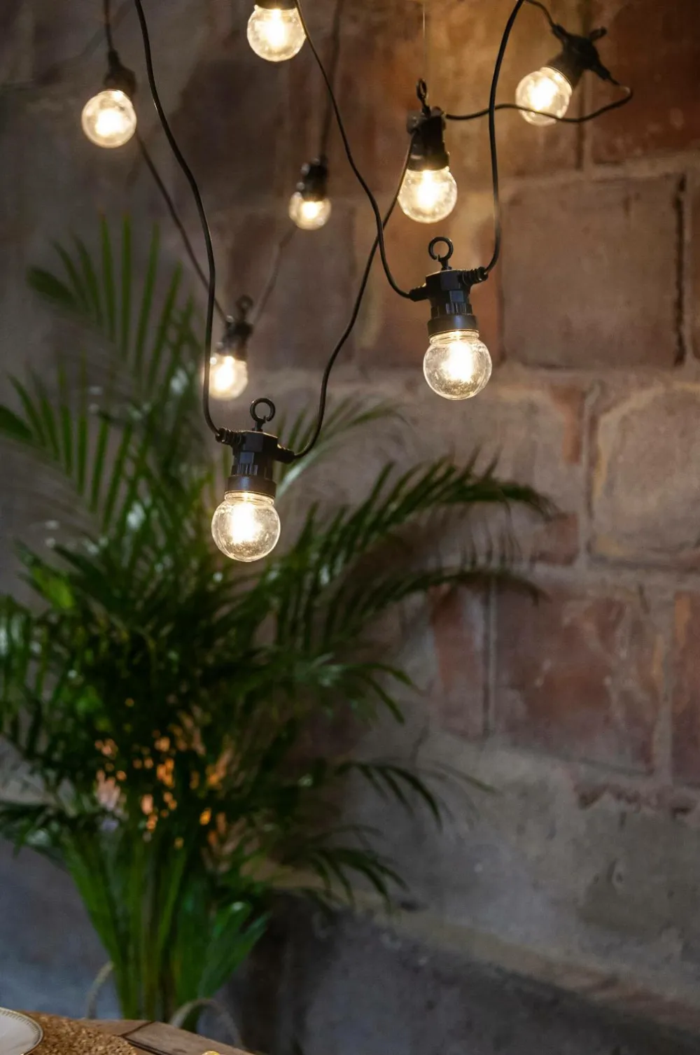 Partylyskæde med transparente kupler og 20 LED-pærer med filament. Skøn lyskæde at pynte op med til hverdag og til fest. Giver et smukt lysskær i mørket. Varmt hvidt lys. Der er 45 cm mellem pærerne. Lyskædens længde, 880 cm. Pærernes højde , 10 cm og diameter 5 cm. Tilslutningskablets længde er 500 cm. Kan bruges udendørs.