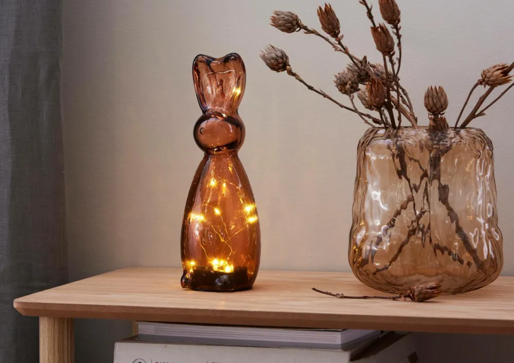 Stilfuld borddekoration i glas. Placeres på et bord eller en bænk og giver et smukt skær. en fin dekoration til påskens borddækning, men velegnet til hele året rundt. Batteridrevet med timerfunktion til indendørs brug.