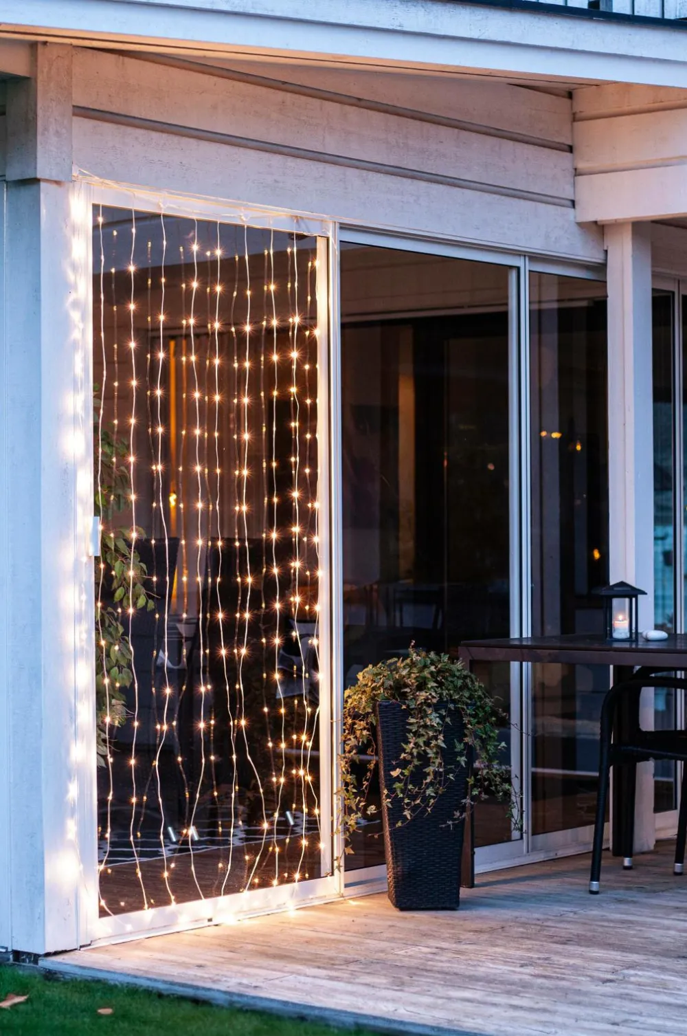 Lysgardin til udendørs brug med tynde, diskrete, gennemsigtige kabler, størrelse 1x2m. 10 strenge med 20 små varmhvide led-lyspunkter på hver streng. Lys terrassen, festteltet eller f.eks. væggen op for et stemningsfuldt lys. Ip44-klassificeret transformer.