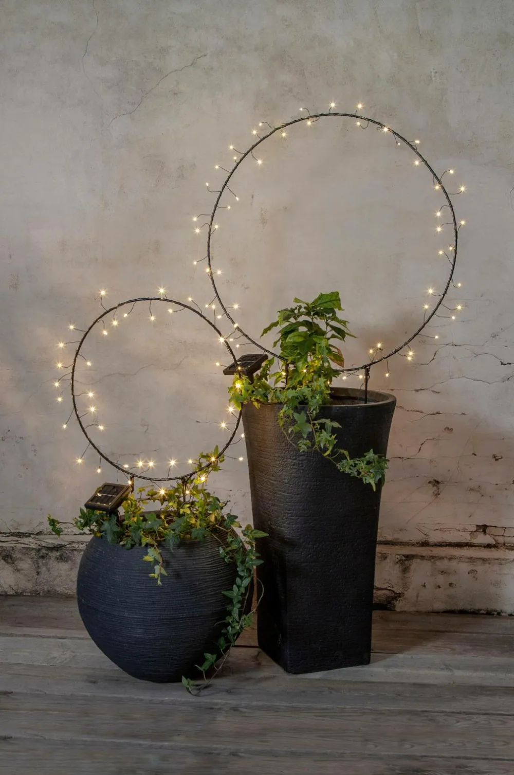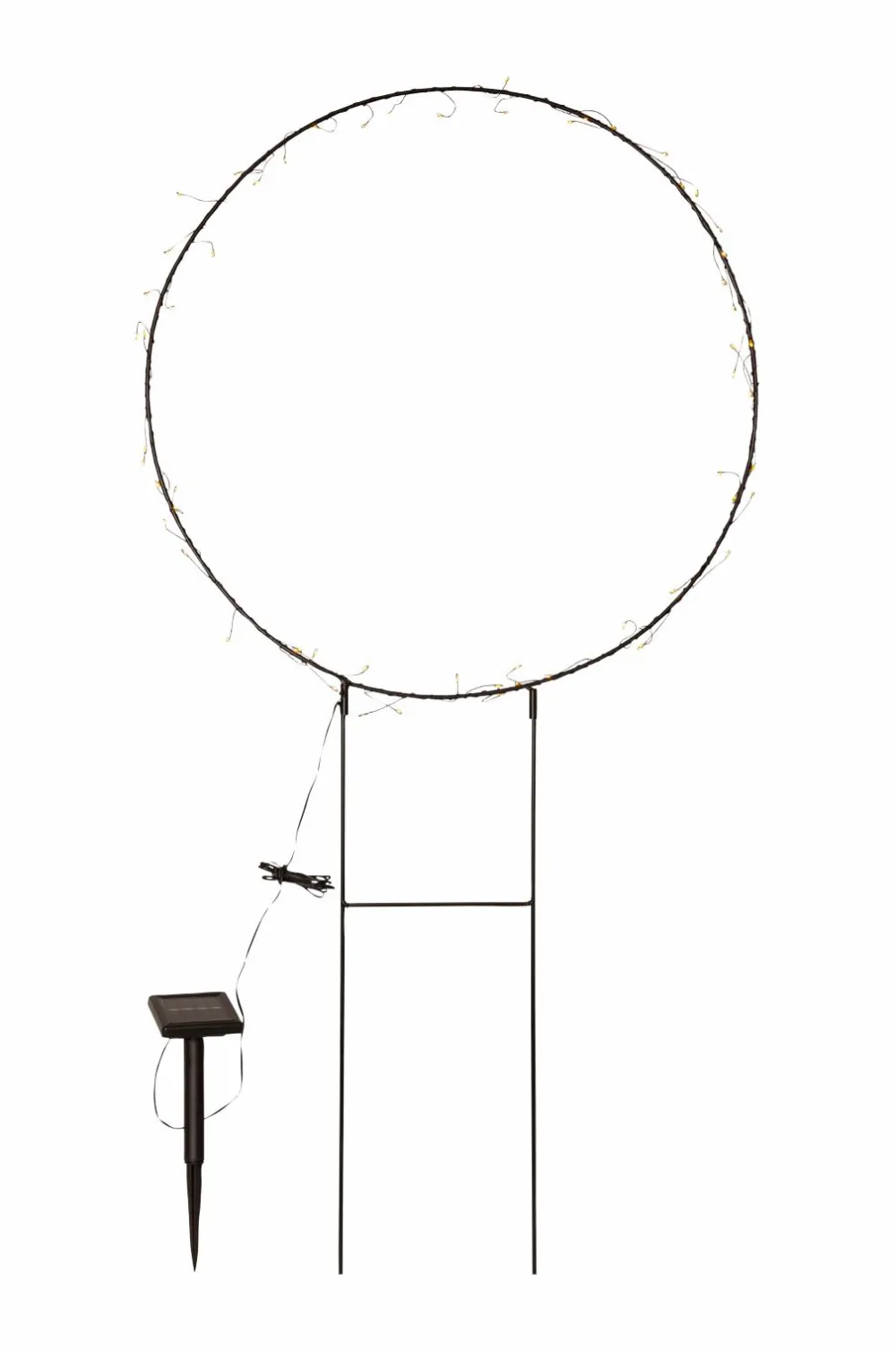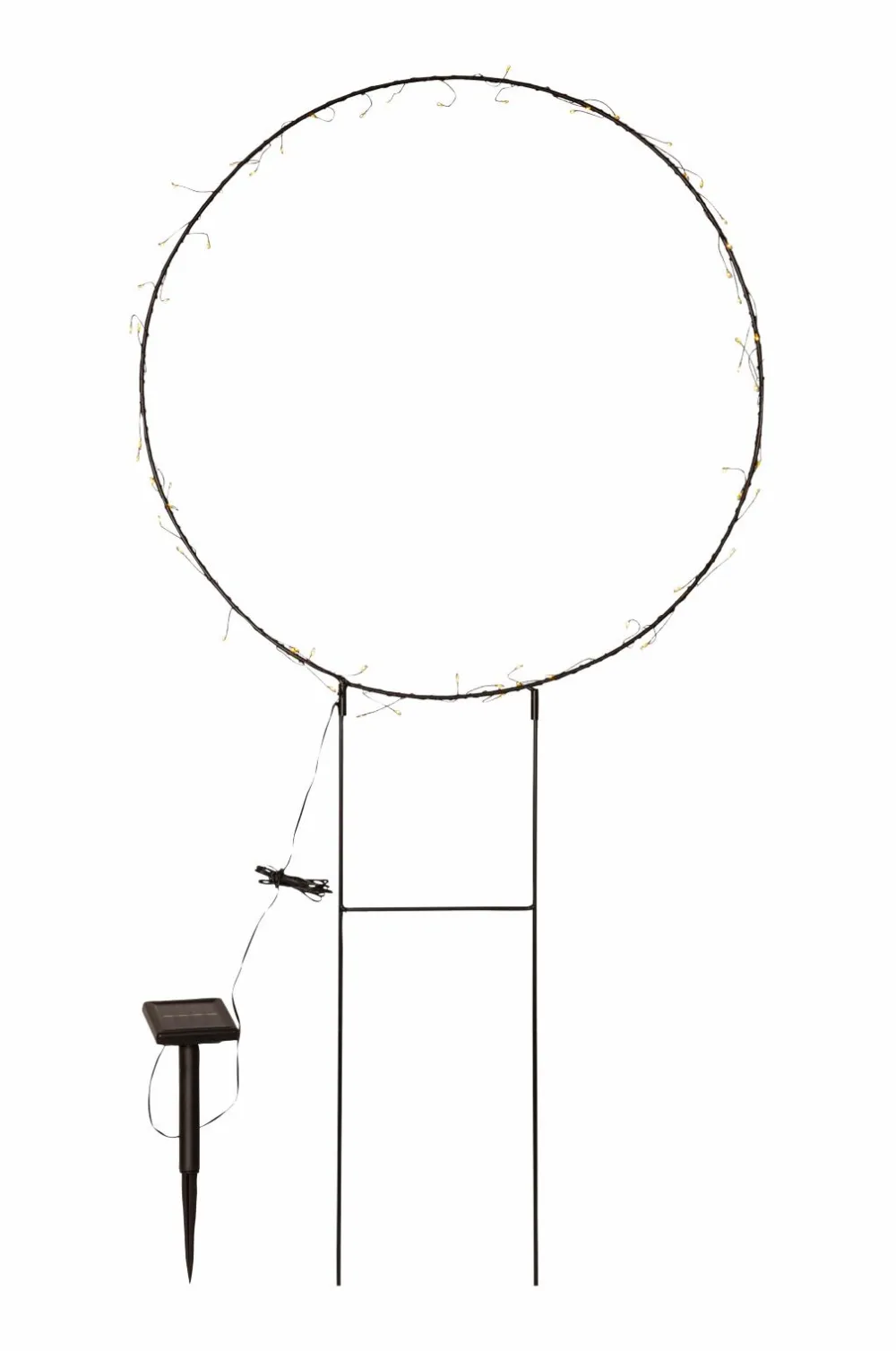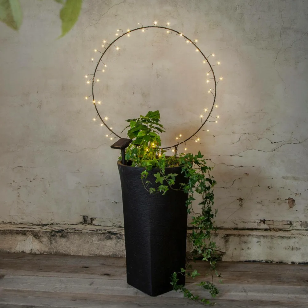 Solcelledekorationen Barlumi er en havedekoration i form af en 40 cm cirkel med små lyspunkter som lyser rundt om cirklen. Solcellen bliver en smuk dekoration og placeres nemt i en plantekasse i haven eller på en altan eller terrasse. Den leveres med et stativ, som cirklen er fastgjort til. Solcelledekorationen lyser op med 40 varmhvide LED’er, der lyser om natten. Selve paneldelen er fastgjort med et 2 meter kabel fra dekorationen, dette gør det nemt at placere panelet i direkte sollys, hvilket er nødvendigt for at oplade det medfølgende batteri.