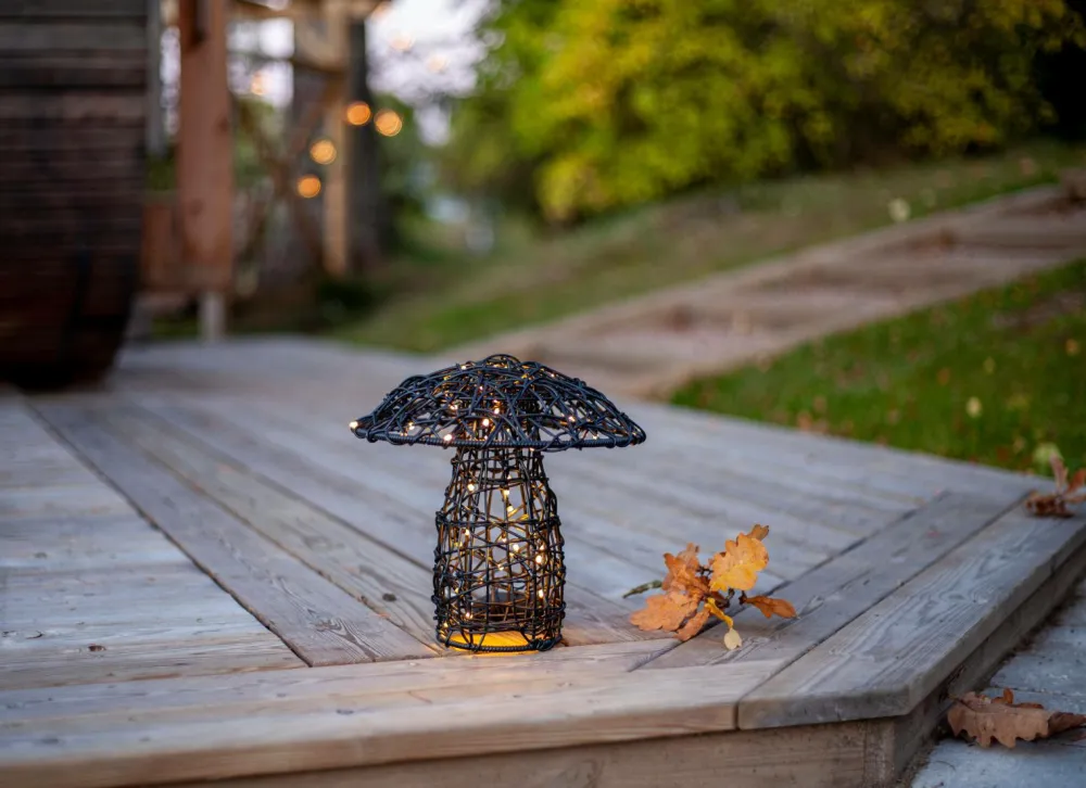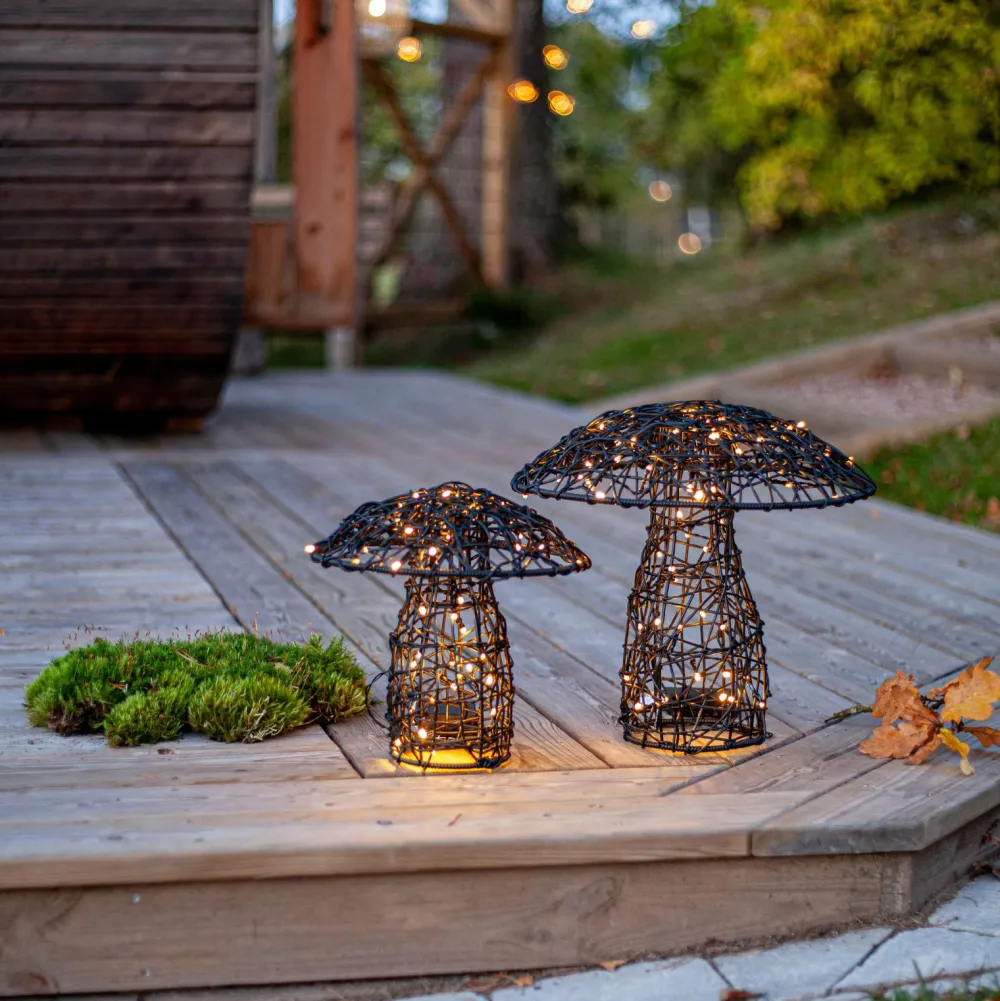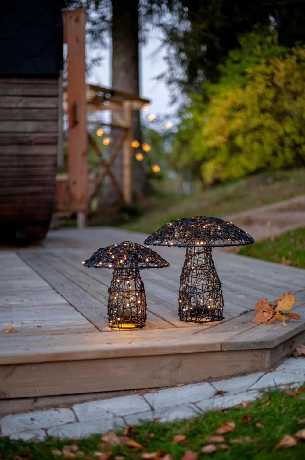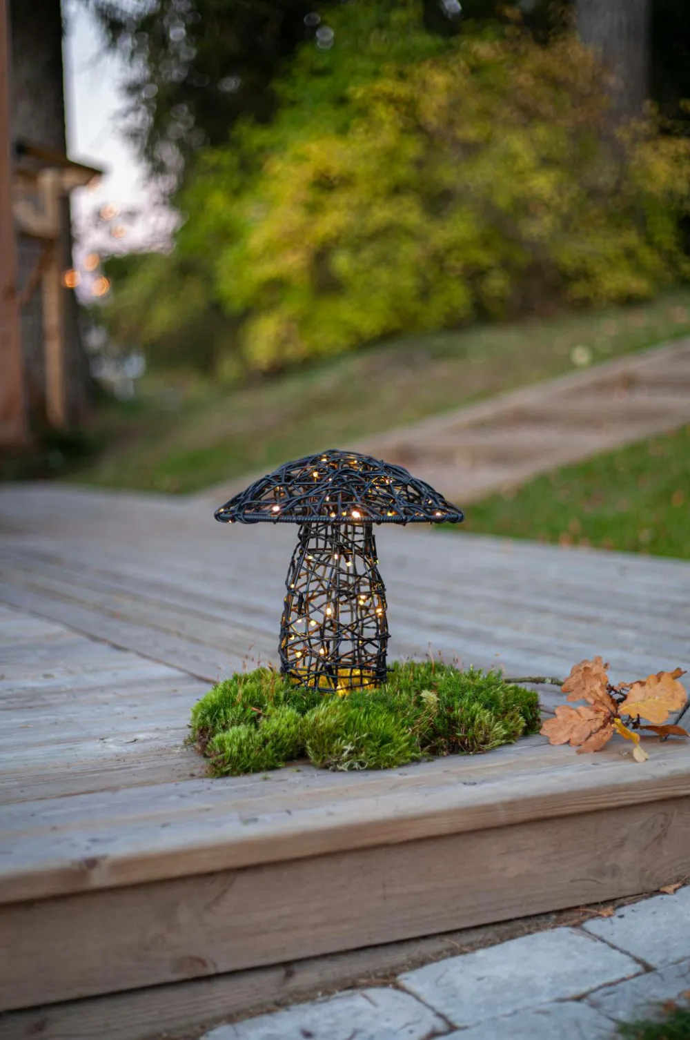 Batteridrevet udendørs dekoration i form af en champignon, 25 cm høj. Fremstillet af sort rattan med metalramme. Batteriboksen drives af 3 stk. aa-batterier (medfølger ikke). En smuk dekoration til terrassen og haven.