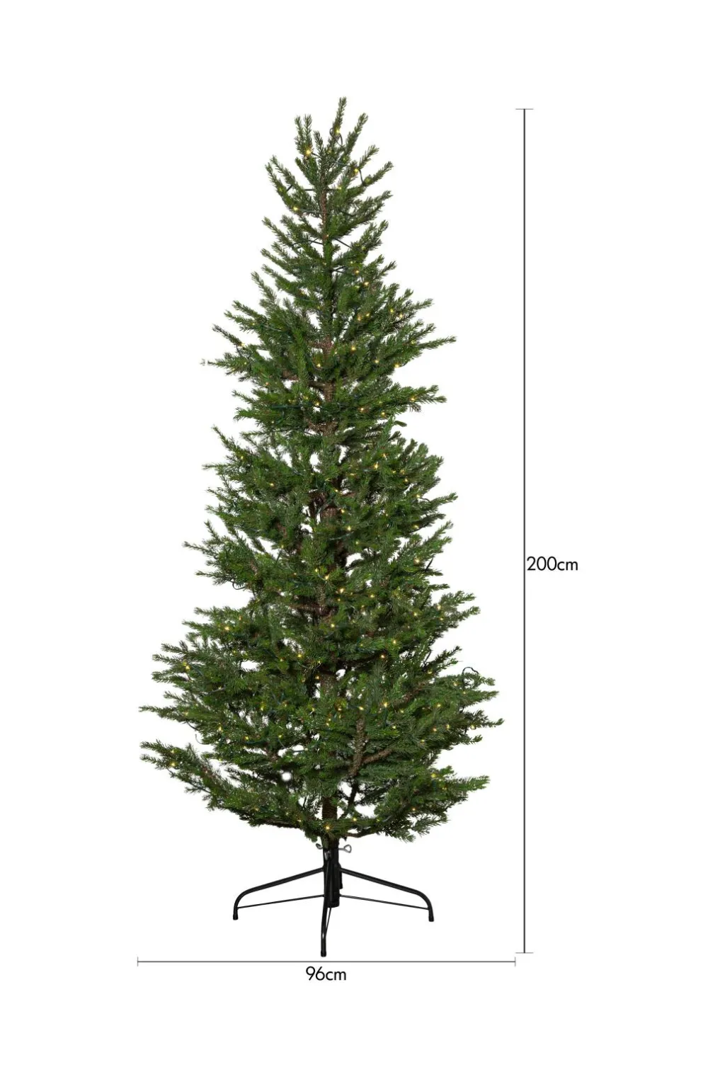 Skønt og virkelighedstro juletræ i en flot grøn farve. Juletræet er 200 cm højt og cirka 96 cm bredt. Juletræet har 240 LED-pærer, der ikke kan udskiftes, og som skaber en hyggelig belysning. IP44 til udendørs brug med 5 m ledning.