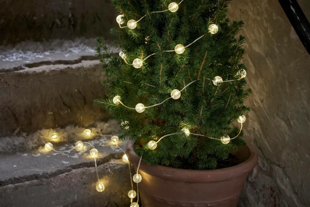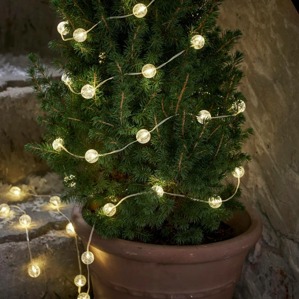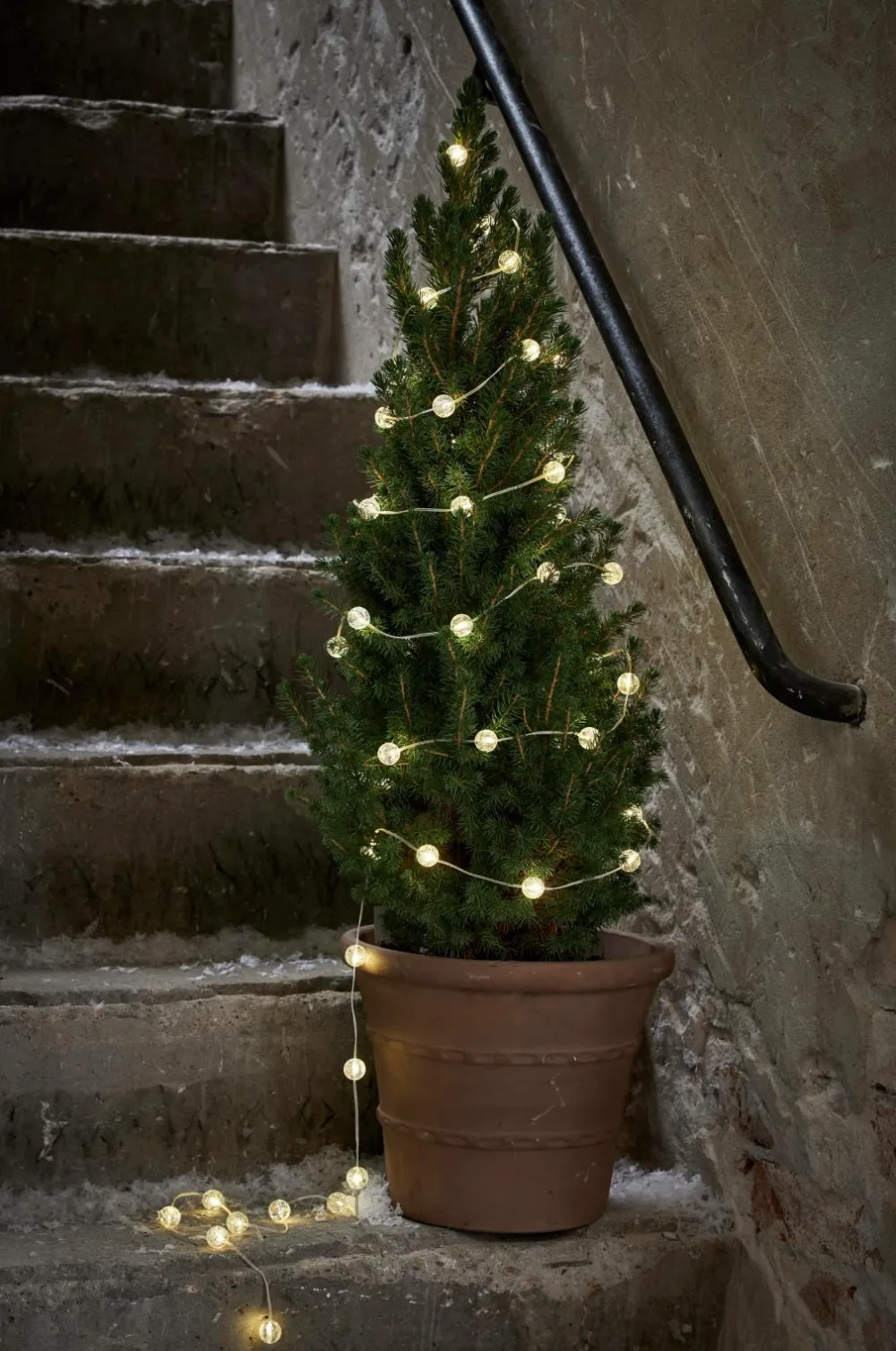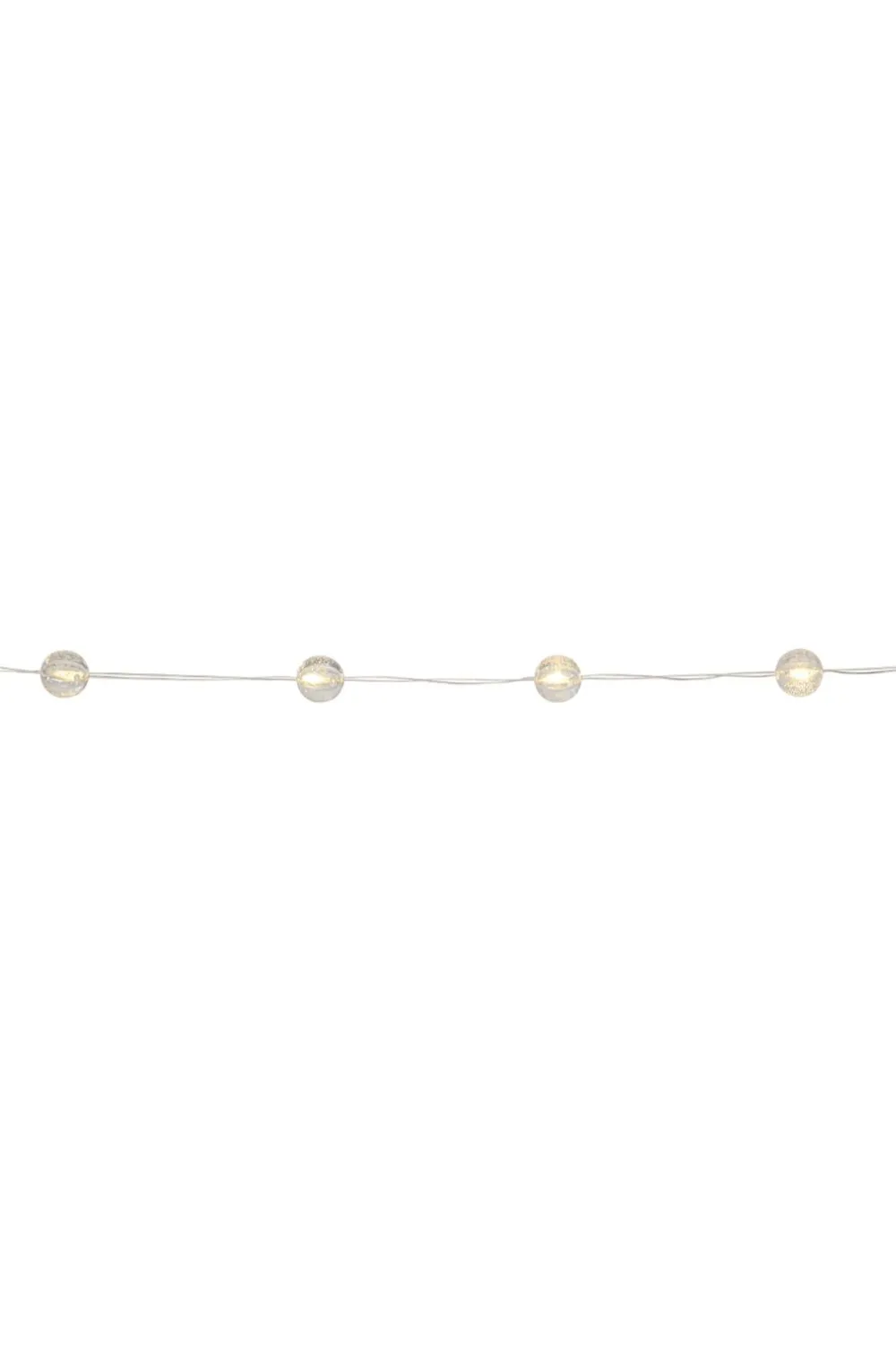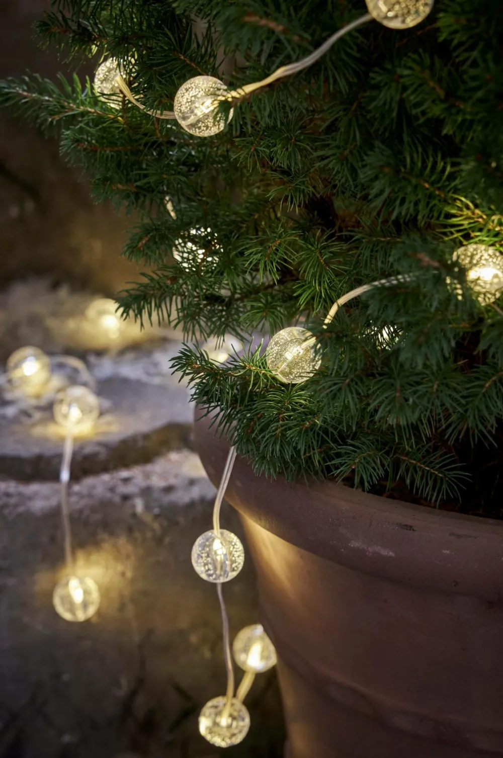 Batteridrevet lyskæde med 50 varmhvide LED’er og gennemsigtige kugledekorationer. Batteriboks til udendørs brug med 8 forskellige blinksekvenser og timerfunktion. Skøn lyskæde at pynte op med i haven til hverdag og til fest. Giver et smukt lysskær i mørket. Lyskæden er 5 meter lang.