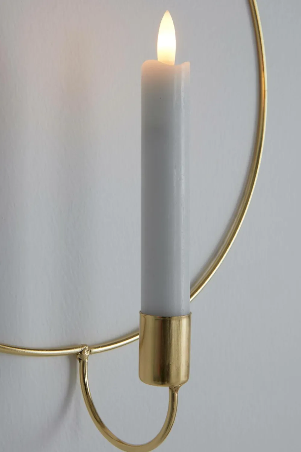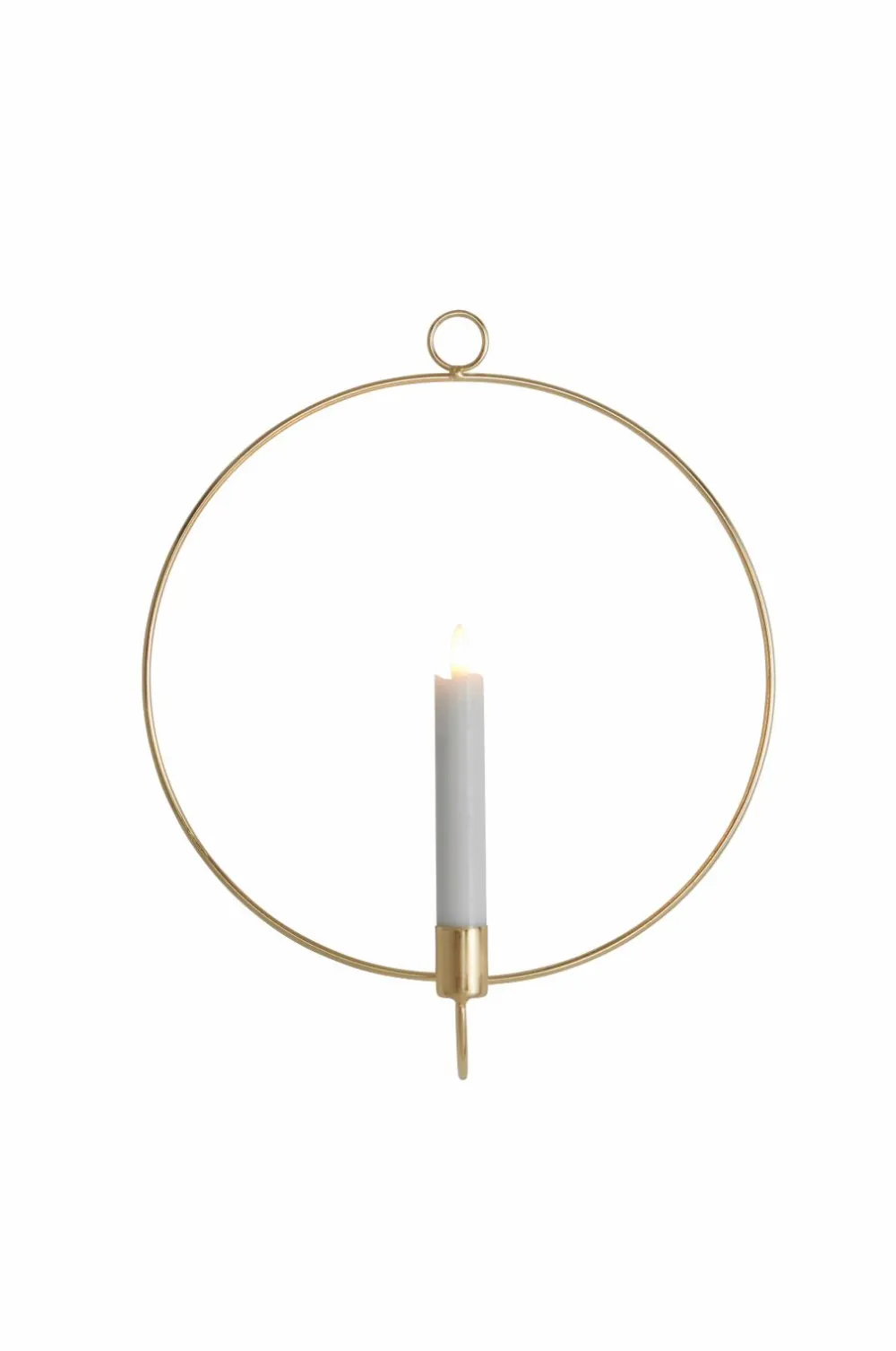 Vægdekoration i metal med messingfinish, formet som en ring med dekorativt LED-antiklys. CANDLE RING har en indbygget repeterende timer som er tændt i 6 timer og slukket i 18. Drives af 1 stk. AA-batteri. Batterier medfølger ikke.