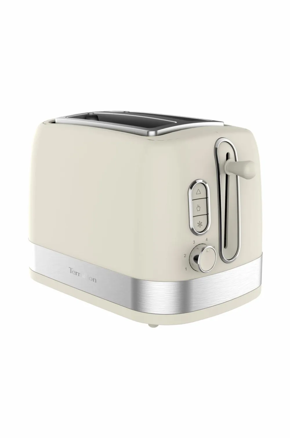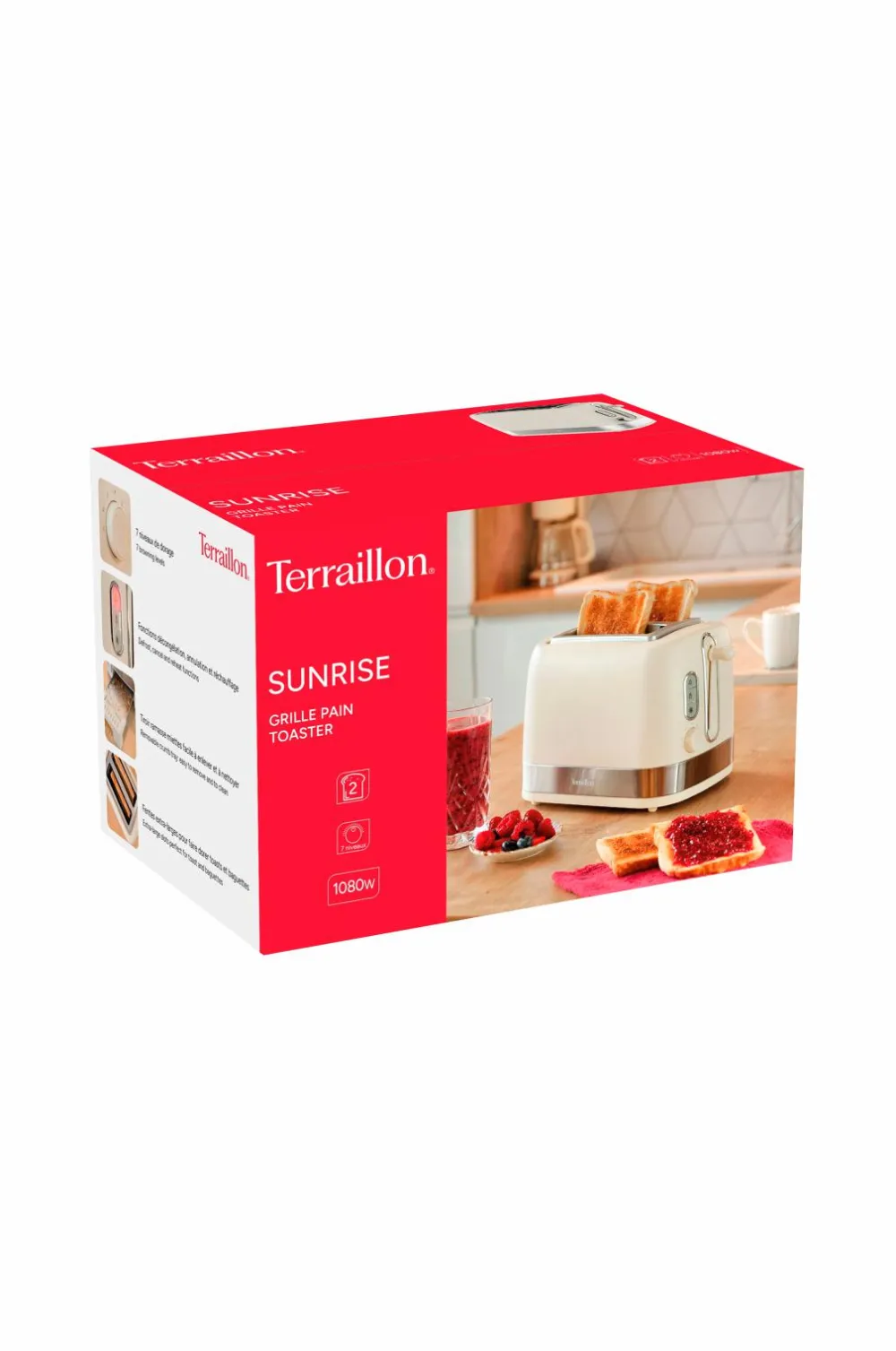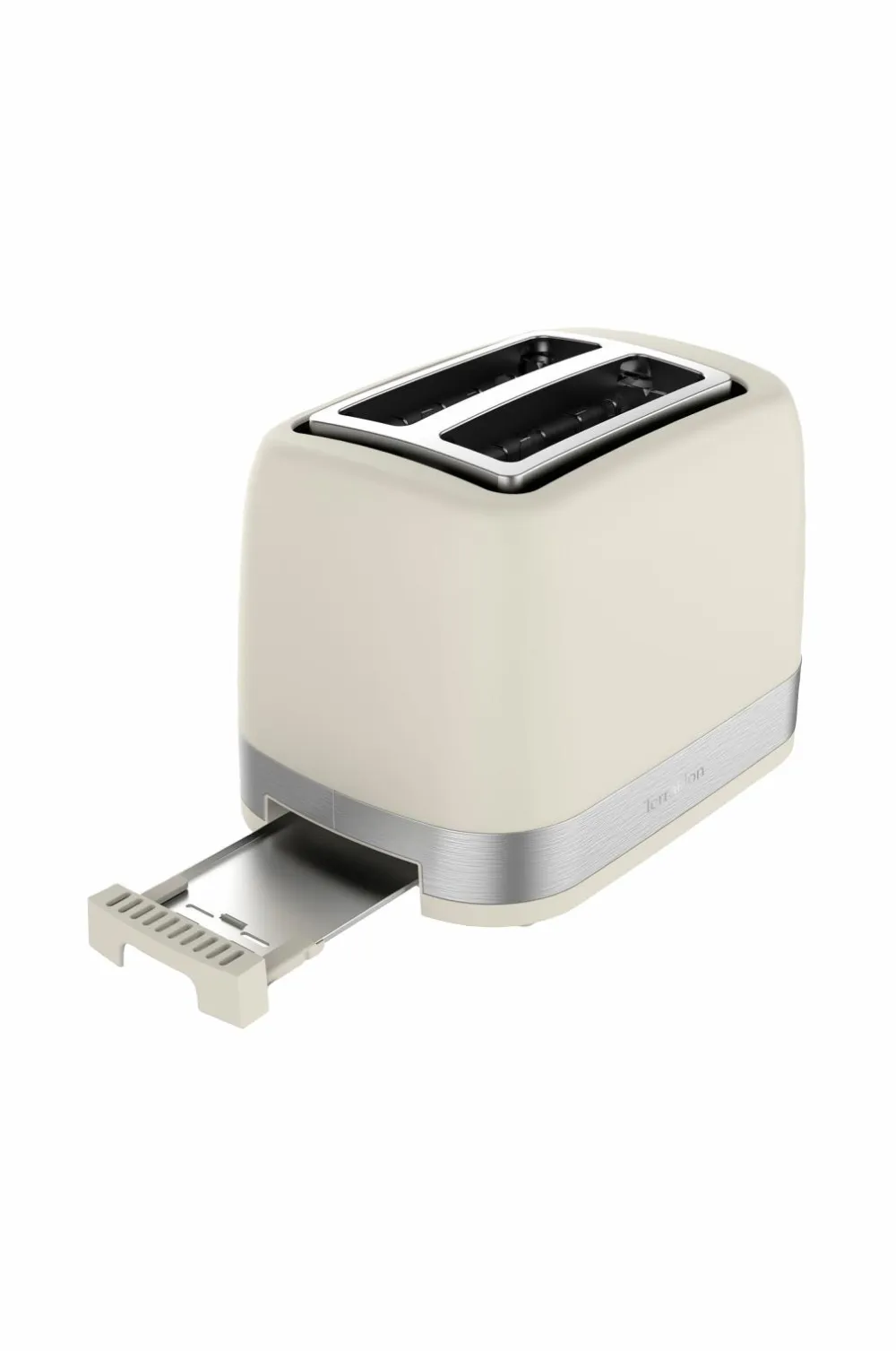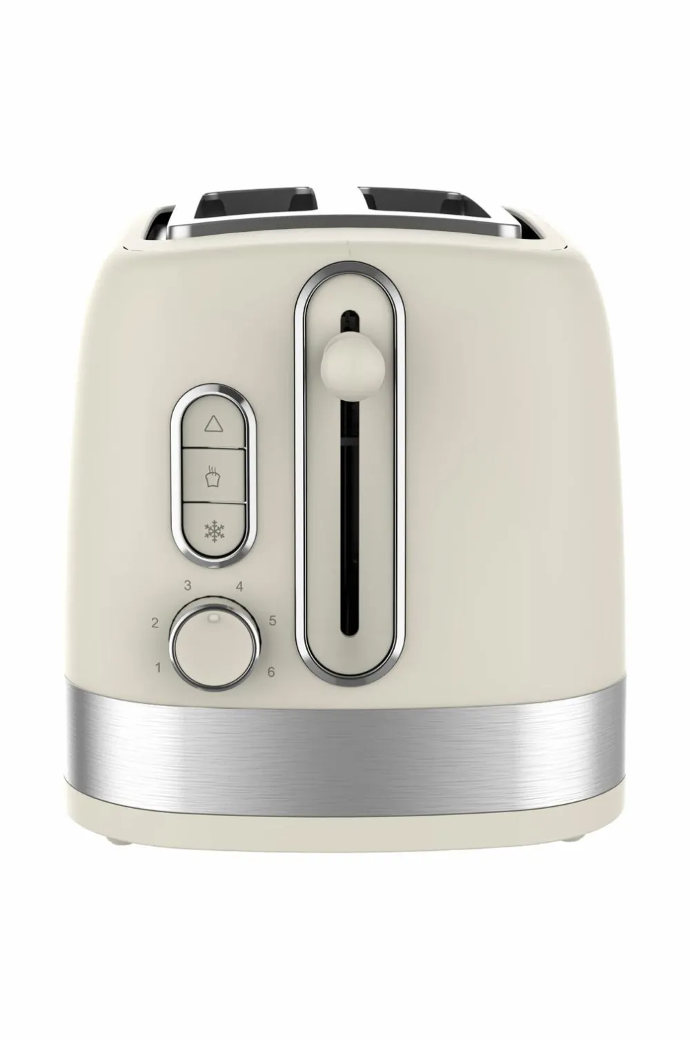 Cremefarvet SUNRISE-brødrister i elegant design med detaljer i rustfrit stål, der kombinerer stil og funktionalitet til lækre morgener!