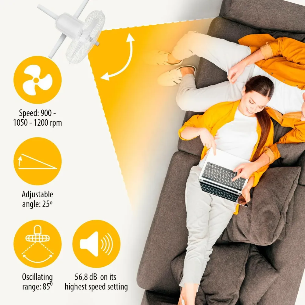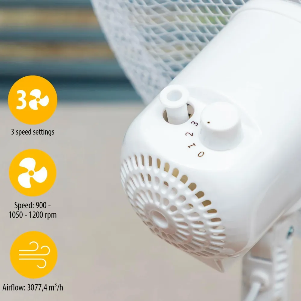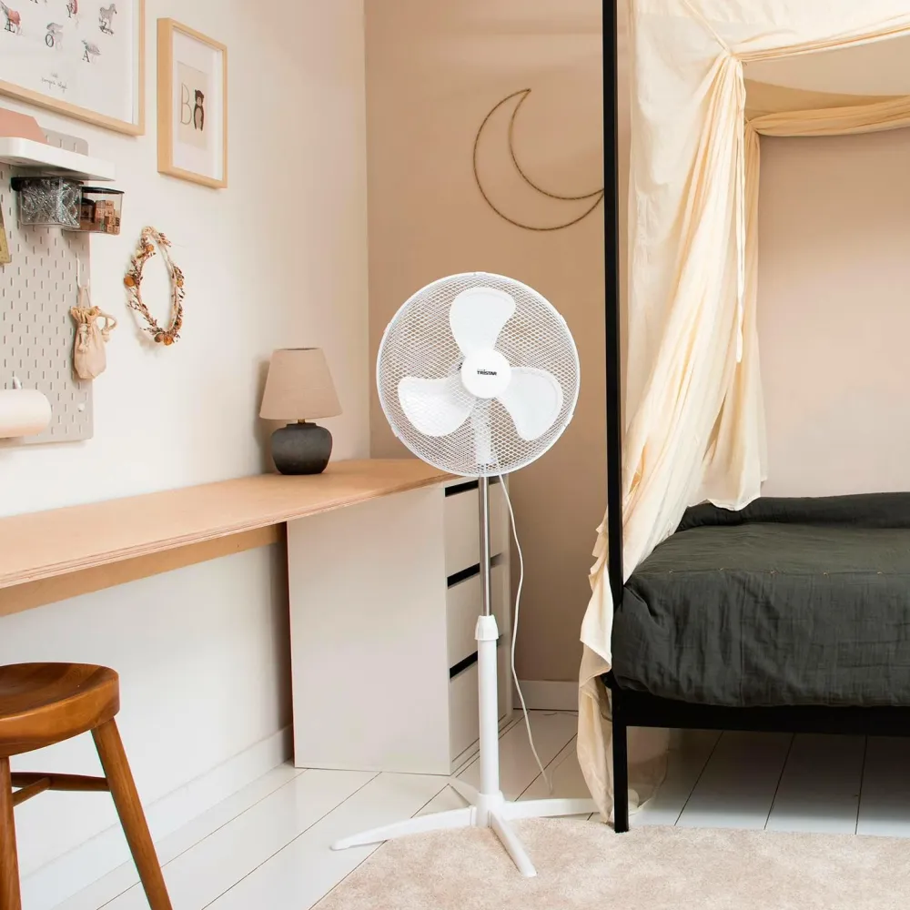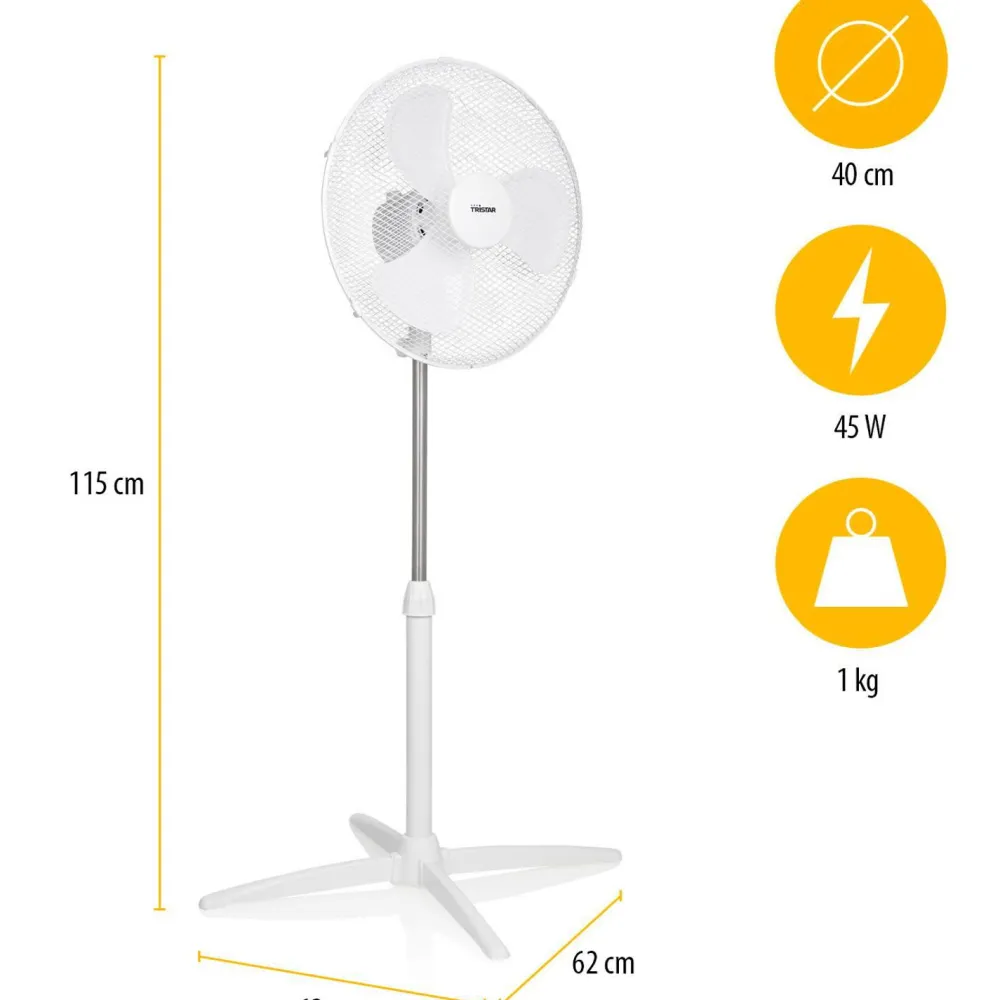 Oplev kølighed med Tristar-gulvventilatoren på varme dage. Med en motor på 30 watt og en diameter på 23 cm giver ventilatoren effektiv afkøling. To hastigheder giver optimal luftstrøm. Let at justere og sikker med beskyttelse mod overophedning. Let at flytte takket være dens vægt. Drejefunktion på 85 grader køler større områder. Kan låses med justeringsknap.