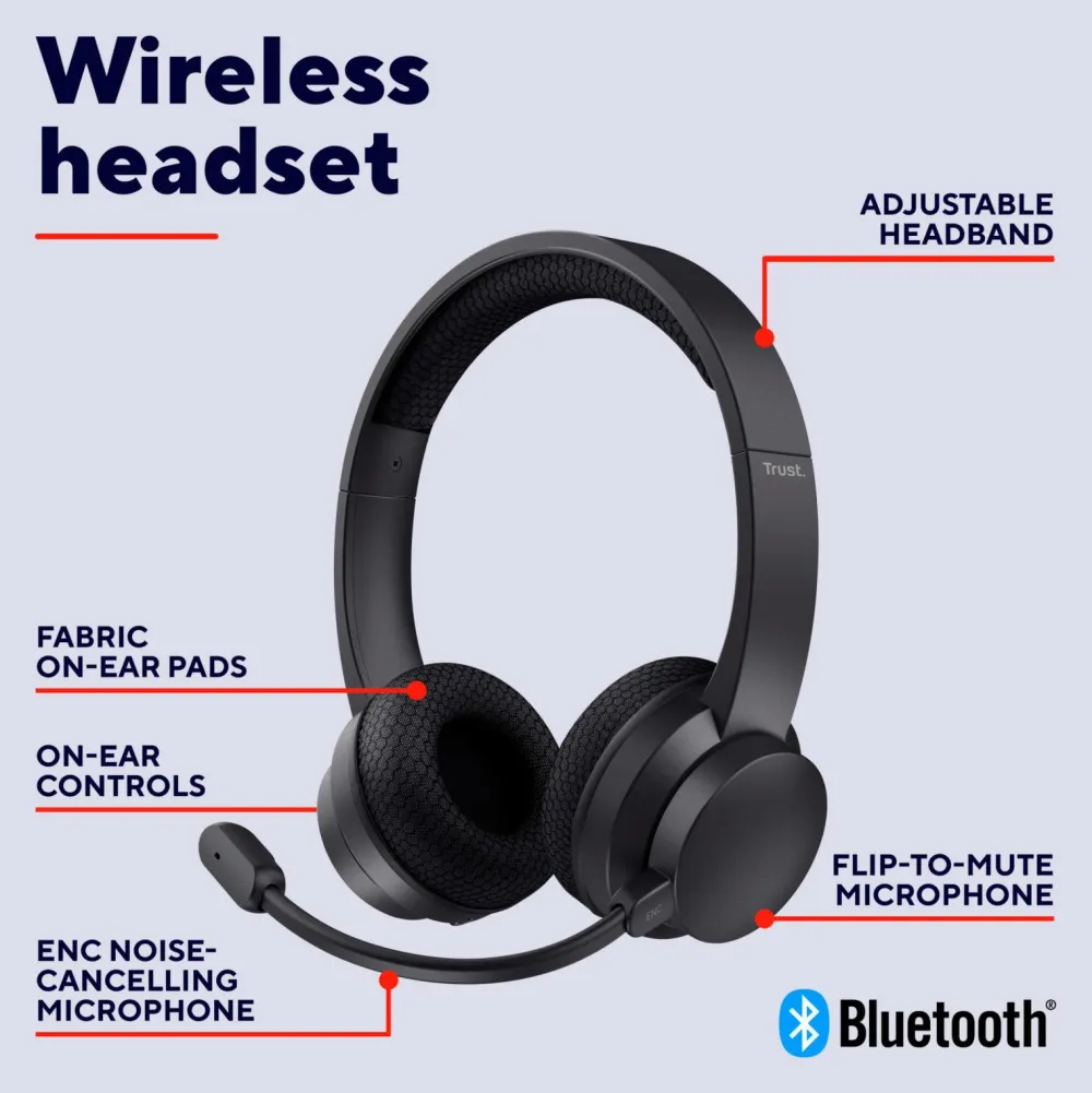 Let, trådløst on-ear headset med støjreducerende mikrofon og justerbar hovedbøjle!
