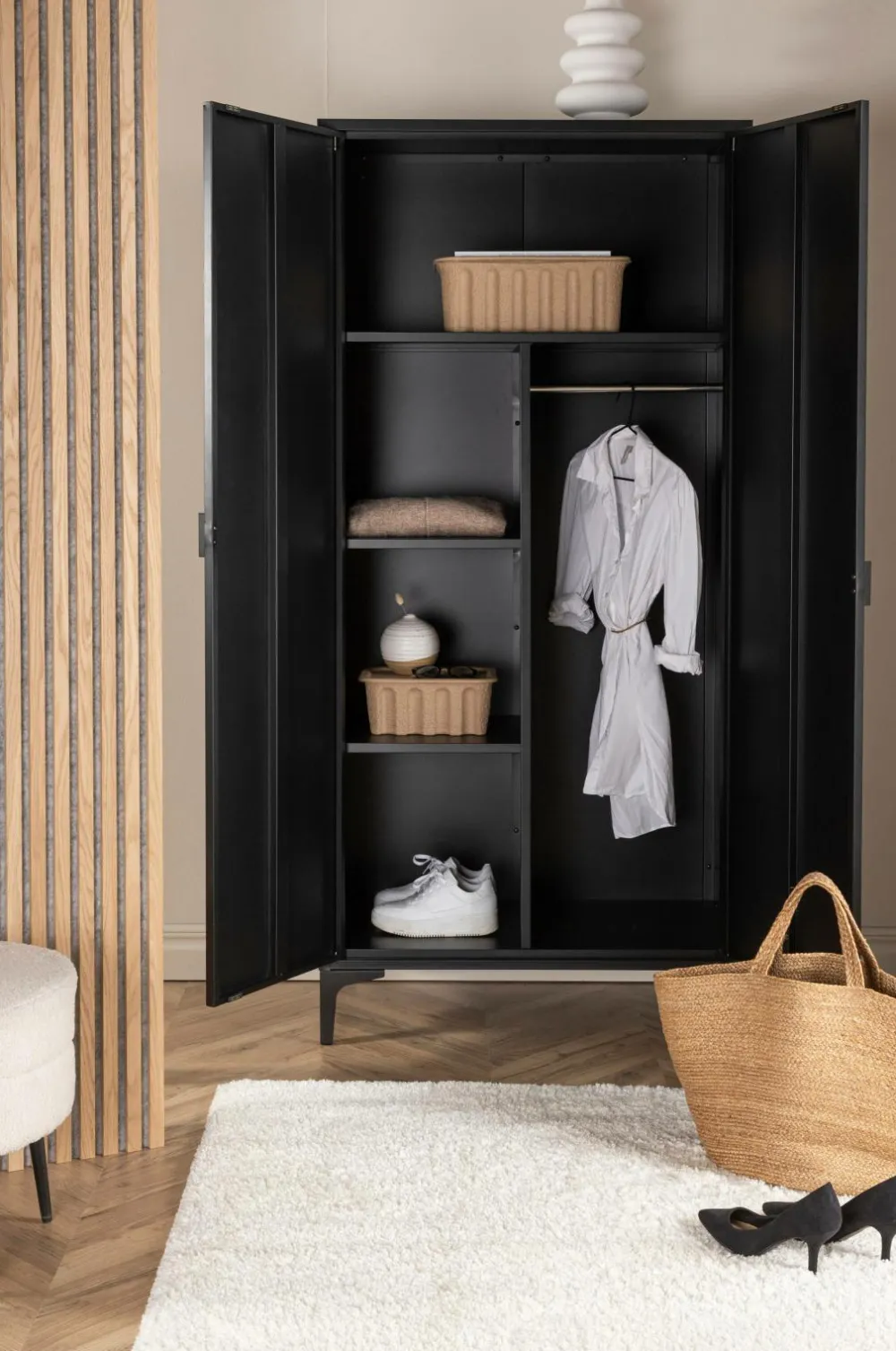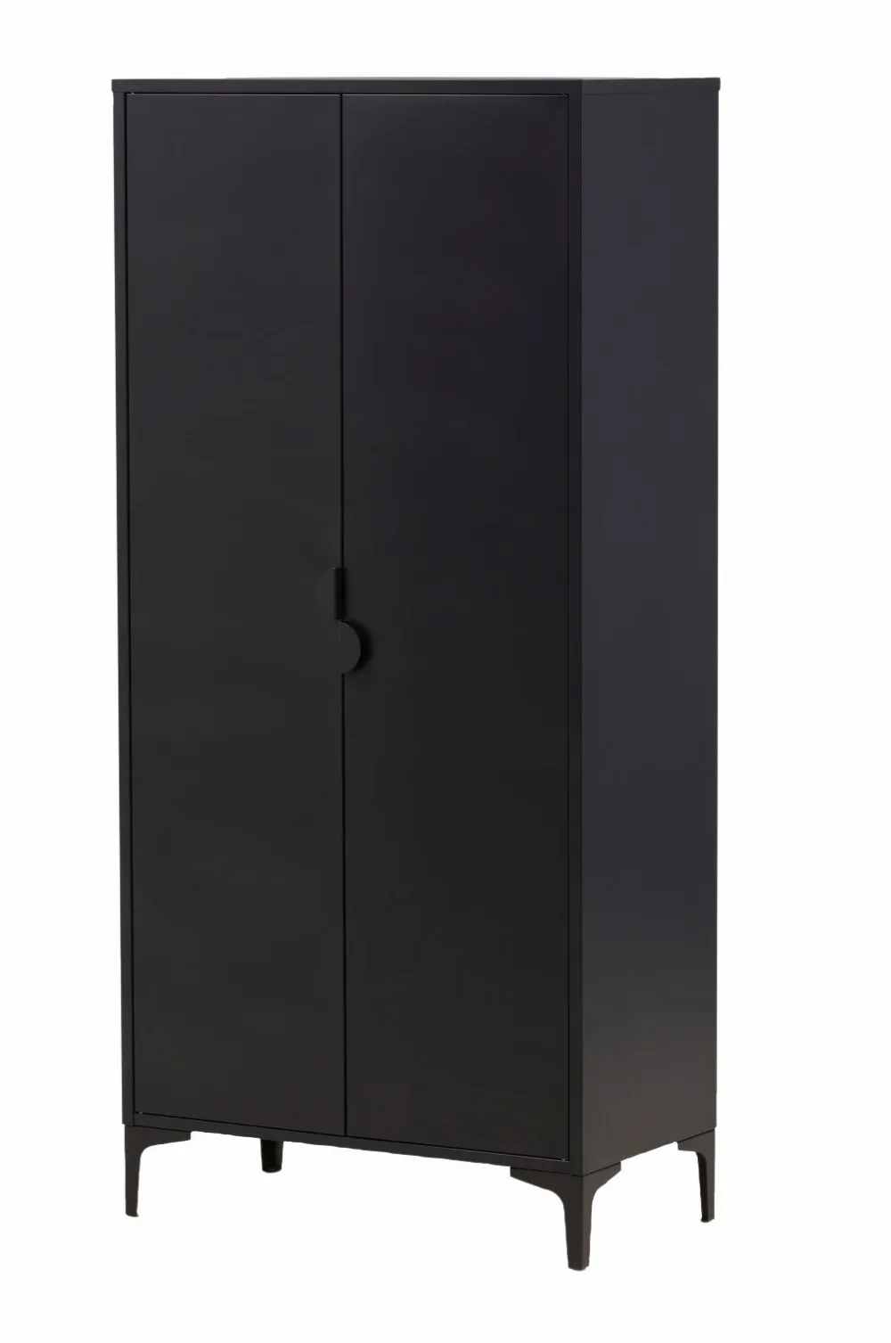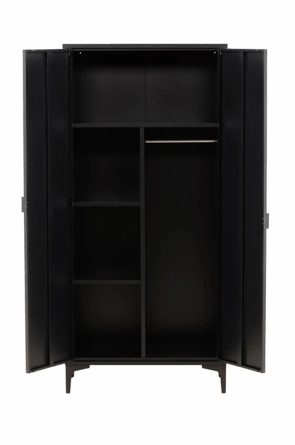 Flot og tidløst Garderobeskabet fra serien Piring er det perfekte supplement til soveværelset! Dette høje garderobeskab i sort stål har to låger, der åbner op til fire hylder og rummer desuden plads til bøjler, så det nystrøgne tøj ikke bliver krøllet. Piring løftes op af fire slanke ben, der skaber et luftigt udtryk og gør det nemt at støvsuge under skabet. Invester i mere opbevaring til dig selv og få et flot møbel i dit bolig med i købet!
