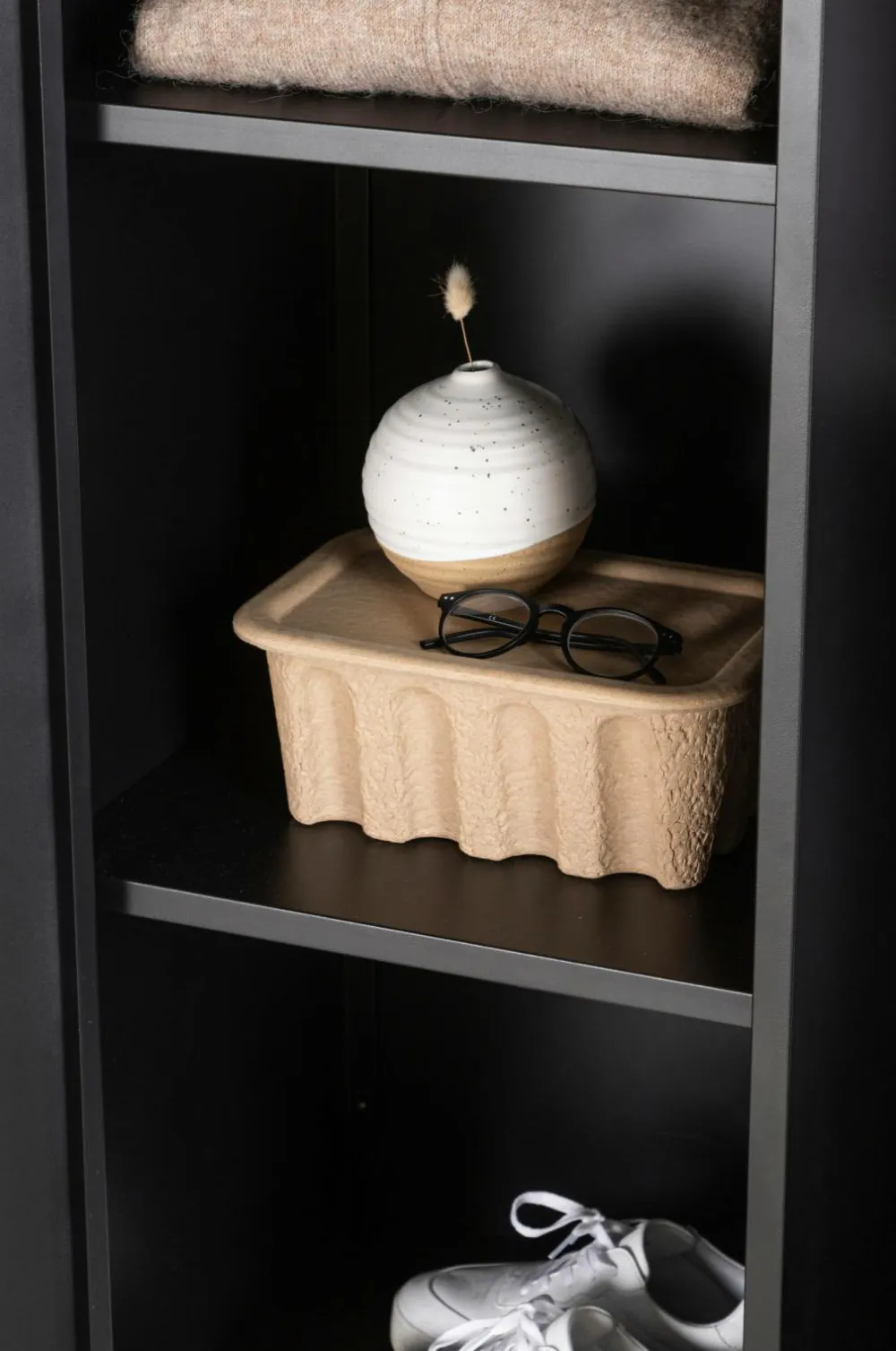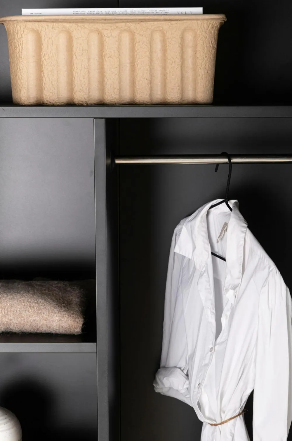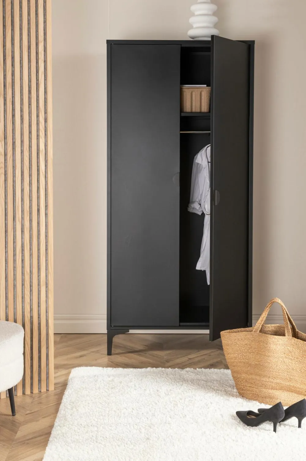 Flot og tidløst Garderobeskabet fra serien Piring er det perfekte supplement til soveværelset! Dette høje garderobeskab i sort stål har to låger, der åbner op til fire hylder og rummer desuden plads til bøjler, så det nystrøgne tøj ikke bliver krøllet. Piring løftes op af fire slanke ben, der skaber et luftigt udtryk og gør det nemt at støvsuge under skabet. Invester i mere opbevaring til dig selv og få et flot møbel i dit bolig med i købet!