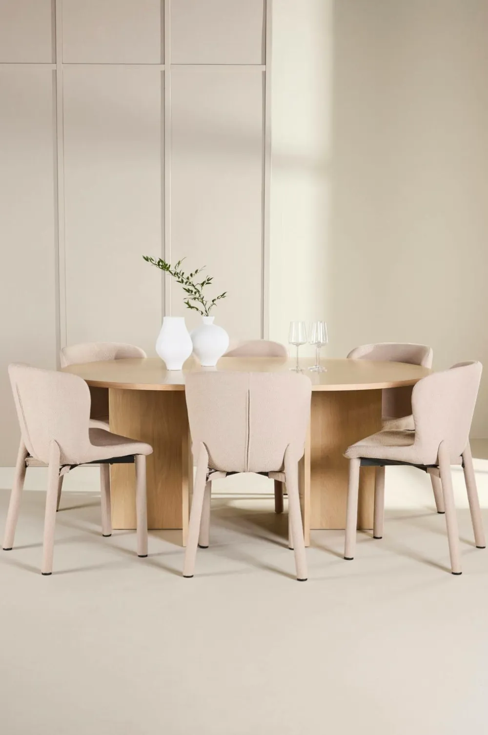 astoria-spisestolen og strada-spisebordet skaber sammen en harmonisk og stilfuld spiseplads. Kombinationen af de luksuriøse bouclé-stole og det fleksible, elegant designede bord giver den perfekte blanding af funktionalitet og æstetik. Lad dette spisebordssæt blive hjertet i dit hjem, og oplev, hvordan astoria og strada gør hvert måltid til en elegant og fornøjelig begivenhed.